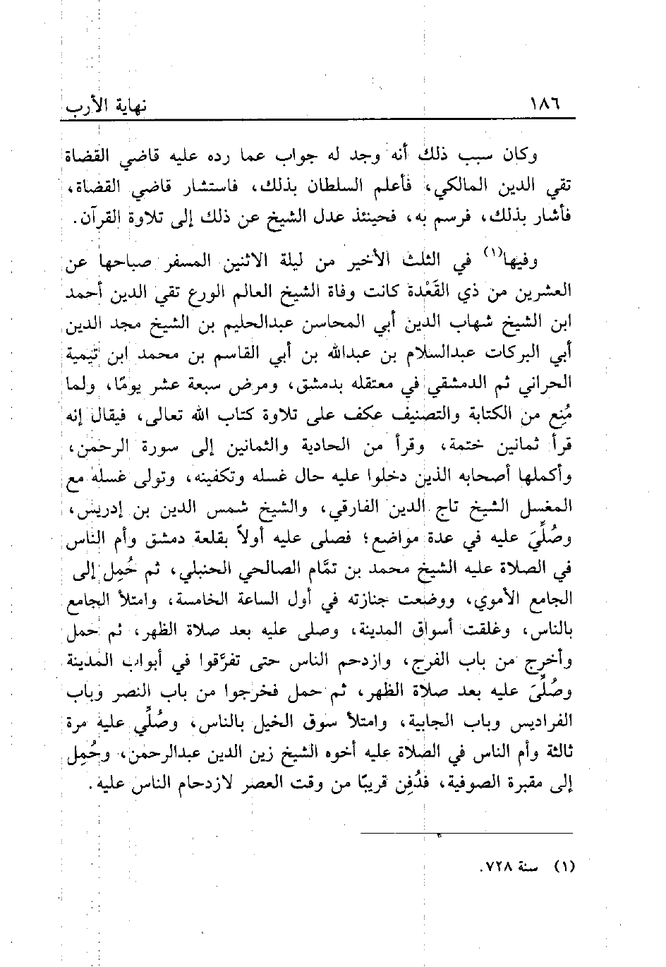 وفيها (¬1) في الثلث الأخير من ليلة الاثنين المسفر صاحبها عن العشرين من ذي القَعْدة كانت وفاة الشيخ العالم الورع تقي الدين أحمد ابن الشيخ شهاب الدين أبي المحاسن عبد الحليم بن الشيخ مجد الدين أبي البركات عبد السلام بن عبد الله بن أبي القاسم بن محمد ابن تيمية الحراني ثم الدمشقي في معتقله بدمشق، ومرض سبعة عشر يومًا، ولما مُنع من الكتابة والتصنيف عكف على تلاوة كتاب الله تعالى، فيقال إنه قرأ ثمانين ختمة، وقرأ من الحادية والثمانين إلى سورة الرحمن، وأكملها أصحابه الذين دخلوا عليه حال غسله وتكفينه، وتولى غسله مع المغسل الشيخ تاج الدين الفارقي، والشيخ شمس الدين بن إدريس، وصُلِّيَ عليه في عدة مواضع؛ فصلى عليه أولاً بقلعة دمشق وأم الناس في الصلاة عليه الشيخ محمد بن تمَّام الصالحي الحنبلي، ثم حُمِل إلى الجامع الأموي، ووضعت جنازته في أول الساعة الخامسة، وامتلأ الجامع بالناس، وغلقت أسواق المدينة، وصلى عليه بعد صلاة الظهر، ثم حمل وأخرج من باب الفرج، وازدحم الناس حتى تفرَّقوا في أبواب المدينة وصُلِّيَ عليه بعد صلاة الظهر، ثم حمل فخرجوا من باب النصر وباب الفراديس وباب الجابية، وامتلأ سوق الخيل بالناس، وصُلِّي عليه مرة ثالثة وأم الناس في الصلاة عليه أخوه الشيخ زين الدين عبد الرحمن، وحُمِل إلى مقبرة الصوفية، فدُفِن قريبًا من وقت العصر لازدحام الناس عليه.