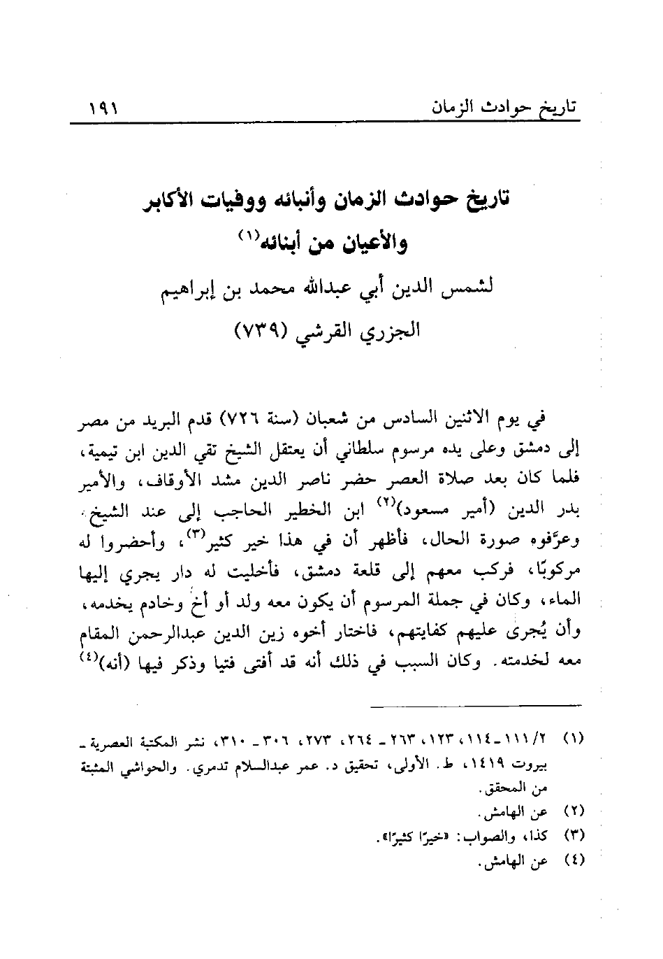 (¬1) 2/ 111 - 114، 123، 263 - 264، 273، 306 - 310، نشر المكتبة العصرية- بيروت 1419، ط. الأولى، تحقيق د. عمر عبد السلام تدمري. والحواشي المثبتة من المحقق.