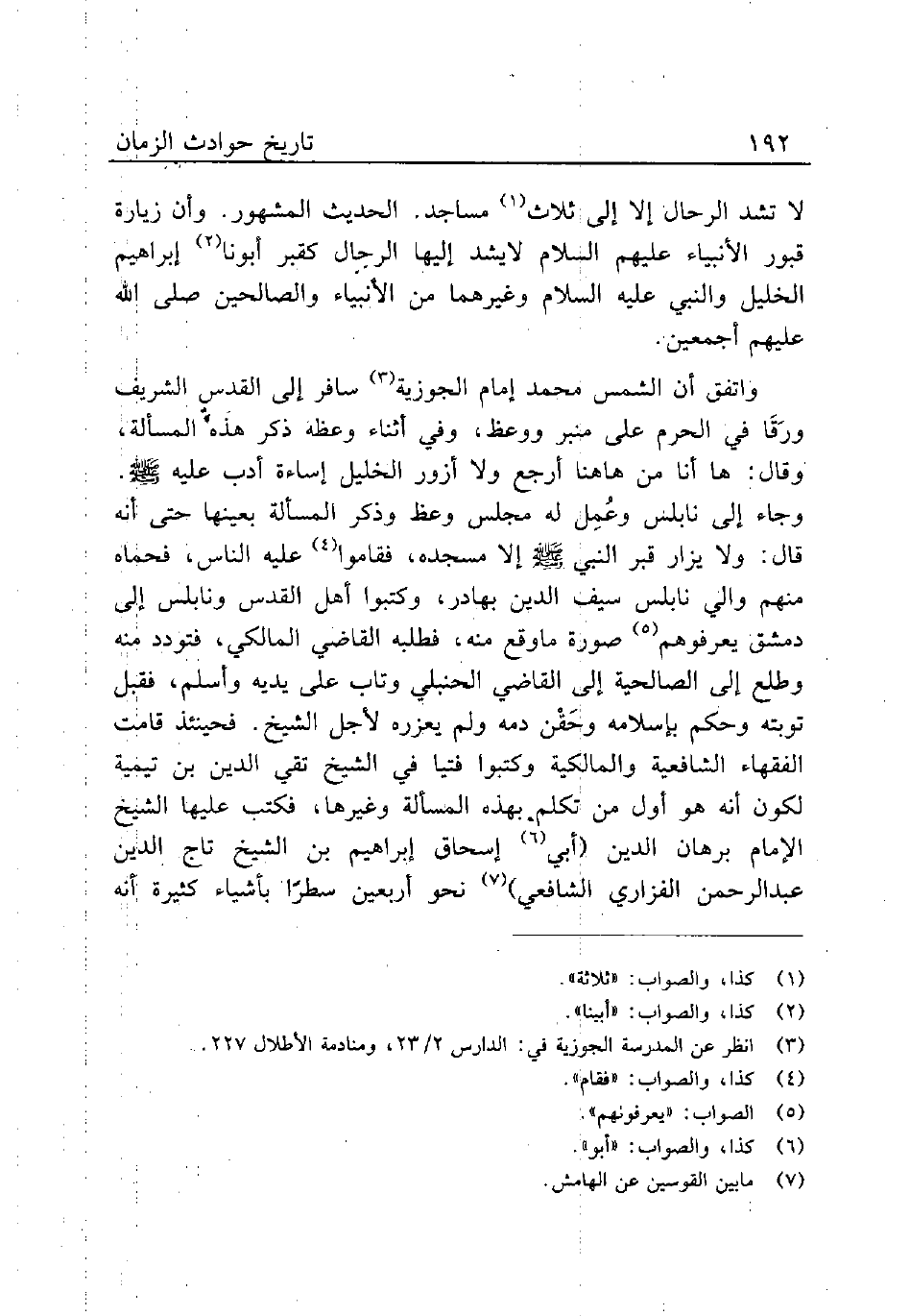 واتفق أن الشمس محمد إمام الجوزية (¬3) سافر إلى القدس الشريف ورَقَا في الحرم على منبر ووعظ، وفي أثناء وعظه ذكر هذه المسألة، وقال: ها أنا هاهنا أرجع ولا أزور الخليل إساءة أدب عليه صلى الله عليه وسلم. وجاء إلى نابلس وعُمِل له مجلس وعظ وذكر المسألة بعينها حتى أنه قال: ولا يزار قبر النبي صلى الله عليه وسلم إلا مسجده، فقاموا (¬4) عليه الناس، فحماه منهم والي نابلس سيف الدين بهادر، وكتبوا أهل القدس ونابلس إلى دمشق يعرفوهم (¬5) صورة ماوقع منه، فطلبه القاضي المالكي، فتودد منه وطلع إلى الصالحية إلى القاضي الحنبلي وتاب عليه يديه وأسلم، فقبل توبته وحكم بإسلامه وحَقْن دمه لم يعزره لأجل الشيخ. فحينئذ قامت الفقهاء الشافعية والمالكية وكتبوا فتيا في الشيخ تقي الدين بن تيمية لكون أنه هو أول من تكلم بهذه المسألة وغيرها، فكتب عليها الشيخ الإمام برهان الدين (أبي (¬6) إسحاق إبراهيم بن الشيخ تاج الدين عبد الرحمن الفزاري الشافعي) (¬7) نحو أربعين سطرًا بأشياء كثيرة أنه