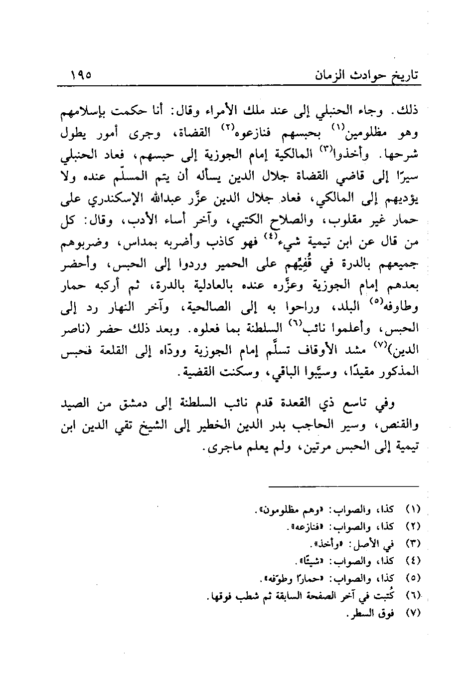 ذلك، وجاء الحنبلي إلى عند ملك الأمراء وقال: أمنا حكمت بإسلامهم وهو مظلومين (¬1) بحبسهم فنازعوه (¬2) القضاة، وجرى أمور يطول شرحها. وأخذوا (¬3) المالكية إمام الجوزية إلى حبسهم، فعاد الحنبلي سيرًا إلى قاضي القضاة جلال الدين يسأله أن يتم المسلّم عنده ولا يؤديهم إلى المالكي، فعاد جلال الدين عزَّر عبد الله الإسكندري على حمار غير مقلوب، والصلاح الكتبي، وآخر أساء الأدب، وقال: كل من قال عن ابن تيمية شيء (¬4) فهو كاذب وأضربه بمداس، وضربوهم جميعهم بالدرة في قُفِيِّهم على الحمير وردوا إلى الحبس، وأحضر بعدهم إمام الجوزية وعزَّره عنده بالعادلية بالدرة، ثم أركبه حمار وطاوفه (¬5) البلد، وراحوا به إلى الصالحية، وآخر النهار رد إلى الحبس، وأعلموا نائب (¬6) السلطنة بما فعلوه. وبعد ذلك حضر (ناصر الدين) (¬7) مشد الأوقاف تسلَّم إمام الجوزية وودّاه إلى القلعة فحبس المذكور مقيدًا، وسيَّبوا الباقي، وسكنت القضية.