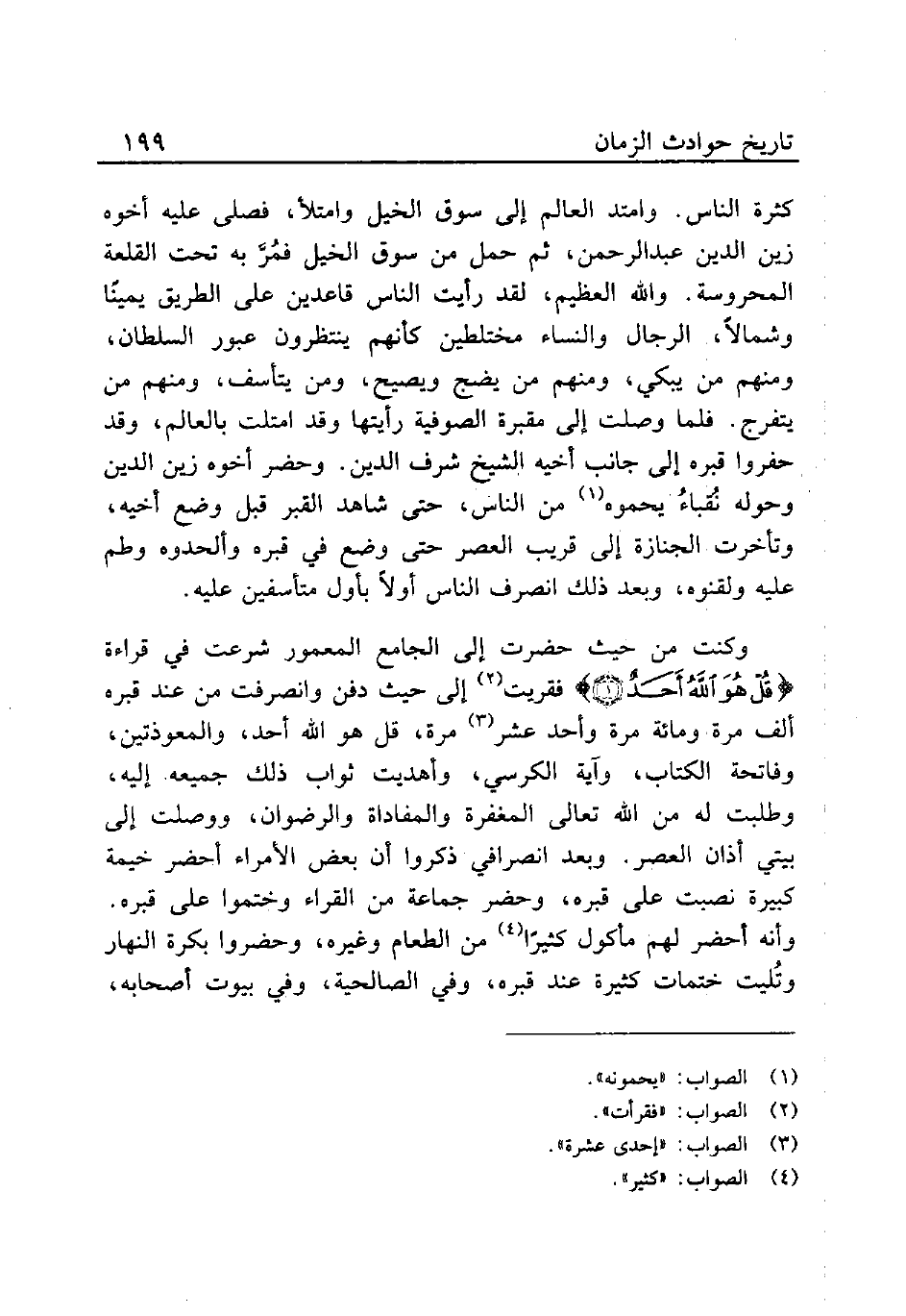 وكنت من حيث حضرت إلى الجامع المعمور شرعت في قراءة {قُلْ هُوَ اللَّهُ أَحَدٌ (1)} فقريت (¬2) إلى حيث دفن وانصرفت من عند قبره ألف مرة ومائة مرة وأحد عشر (¬3) مرة، قل هو الله أحد، والمعوذتين، وفاتحة الكتاب، وآية الكرسي، وأهديت ثواب ذلك جميعه إليه، وطلبت له من الله تعالى المغفرة والمفاداة والرضوان، ووصلت إلى بيتي أذان العصر. وبعد انصرافي ذكروا أن بعض الأمراء أحضروا خيمة كبيرة نصبت على قبره، وحضر جماعة من القراء وختموا على قبره. وأنه أحضر لهم مأكول كثيرًا (¬4) من الطعام وغيره، وحضروا بكرة النهار وتُليت ختمات كثيرة عند قبره، وفي الصالحية، وفي بيوت أصحابه،