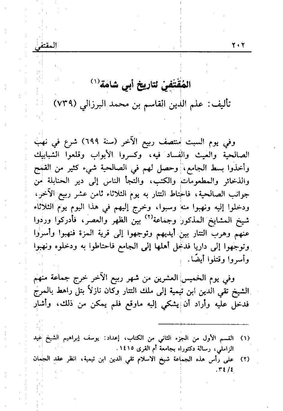 وفي يوم السبت منتصف ربيع الآخر (سنة 699) شرع في نهب الصالحية والعيث والفساد فيه، وكسروا الأبواب وقلعوا الشبابيك وأخذوا بسط الجامع، وحصل لهم في الصالحية شيء كثير من القمح والذخائر والمطعومات والكتب، والتجأ الناس إلى دير الحنابلة من جوانب الصالحية، فاحتاط التتار به يوم الثلاثاء ثامن عشر ربيع الآخر، ودخلوا إليه ونهبوا منه، وخرج إليهم في هذا اليوم يوم الثلاثاء شيخ المشايخ المذكور وجماعة (¬2) بين الظهر والعصر، فأدركوا وردوا عنهم وهرب التتار بين أيديهم وتوجهوا إلى قرية المزة فنهبوا وأسروا وتوجهوا إلى داريا فدخل أهلها إلى الجامع فاحتاطوا به ودخلوه ونهبوا وأسروا وقتلوا أيضًا.