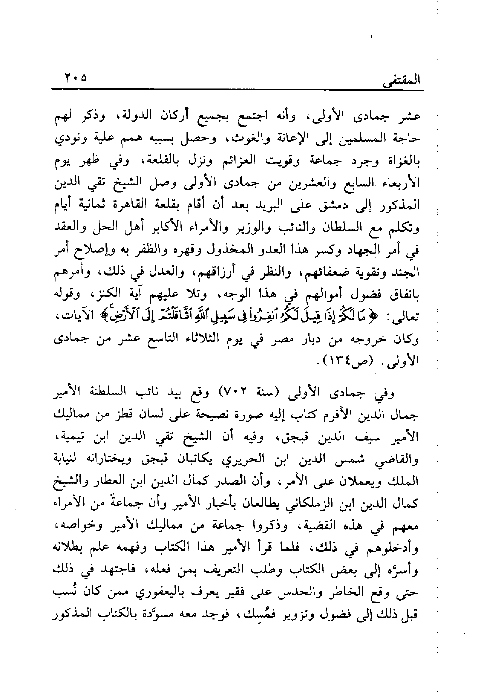 عشر جمادى الأولى، وأنه اجتمع بجميع أركان الدولة، وذكر لهم حاجة المسلمين إلى الإعانة والغوث، وحصل بسببه همم علية ونودي بالغزاة وجرد جماعة وقويت العزائم ونزل بالقلعة، وفي ظهر يوم الأربعاء السابع والعشرين من جمادى الأولى وصل الشيخ تقي الدين المذكور إلى دمشق على البريد بعد أن أقام بقلعة القاهرة ثمانية أيام وتكلم مع السلطان والنائب والوزير والأمراء الأكابر أهل الحل والعقد في أمر الجهاد وكسر هذا العدو المخذول وقهره والظفر به وإصلاح أمر الجند وتقوية ضعائفهم، والنظر في أرزاقهم، والعدل في ذلك، وأمرهم بانفاق فضول أموالهم في هذا الوجه، وتلا عليهم آية الكنز، وقوله تعالى: {مَا لَكُمْ إِذَا قِيلَ لَكُمُ انْفِرُوا فِي سَبِيلِ اللَّهِ اثَّاقَلْتُمْ إِلَى الْأَرْضِ} الآيات، وكان خروجه من ديار مصر في يوم الثلاثاء التاسع عشر من جمادى الأولى. (ص 134).