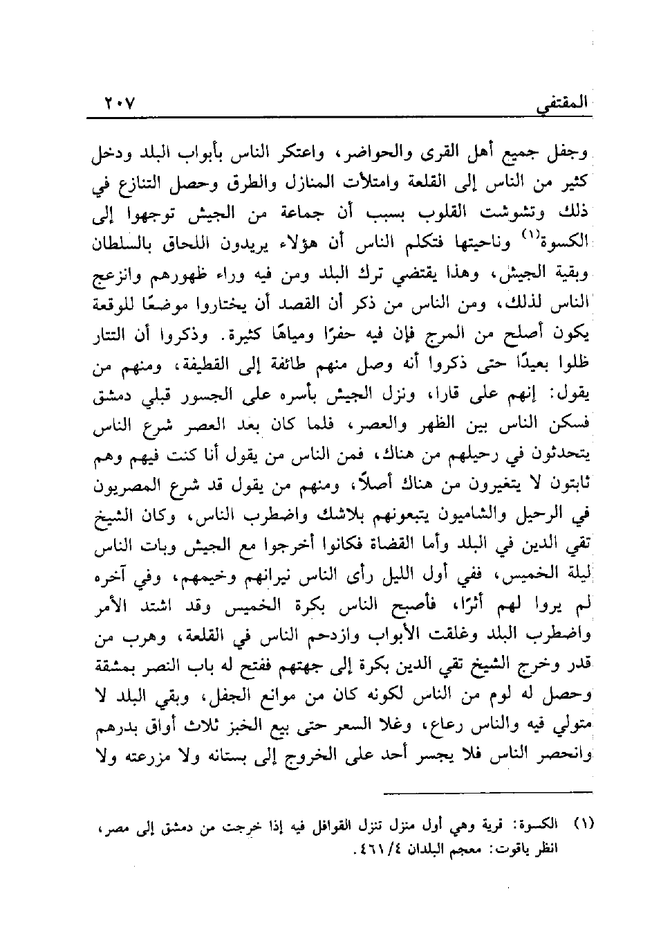 وجفل جميع أهل القرى والحواضر، واعتكر الناس بأبواب البلد ودخل كثير من الناس إلى القلعة وامتلأت المنازل والطرق وحصل التنازع في ذلك وتشوشت القلوب بسبب أن جماعة من الجيش توجهوا إلى الكسوة (¬1) وناحيتها فتكلم الناس أن هؤلاء يريدون اللحاق بالسلطان وبقية الجيش، وهذا يقتضي ترك البلد ومن فيه وراء ظهورهم وانزعج الناس لذلك، ومن الناس من ذكر أن القصد أن يختاروا موضعًا للوقعة يكون أصلح من المرج فإن فيه حفرًا ومياهًا كثيرة. وذكروا أن التتار ظلوا بعيدًا حتى ذكروا أنه وصل منهم طائفة إلى القطيفة، ومنهم من يقول: إنهم على قارا، ونزل الجيش بأسره على الجسور قبلي دمشق فسكن الناس بين الظهر والعصر، فلما كان بعد العصر شرع الناس يتحدثون في رحيلهم من هناك، فمن الناس من يقول أنا كنت فيهم وهم ثابتون لا يتغيرون من هناك أصلاً، ومنهم من يقول قد شرع المصريون في الرحيل والشاميون يتبعونهم بلاشك واضطرب الناس، وكان الشيخ تقي الدين في البلد وأما القضاة فكانوا أخرجوا مع الجيش وبات الناس ليلة الخميس، ففي أول الليل رأى الناس نيرانهم وخيمهم، وفي آخره لم يروا لهم أثراً، فأصبح الناس بكرة الخميس وقد اشتد المر واضطرب البلد وغلقت الأبواب وازدحم الناس في القلعة، وهرب من قدر وخرج الشيخ تقي الدين بكرة إلى جهتهم ففتح له باب النصر بمشقة وحصل له لوم من الناس لكونه كان من موانع الجفل، وبقي البلد لا متولي فيه والناس رعاع، وغلا السعر حتى بيع الخبز ثلاث أوراق بدرهم وانحصر الناس فلا يجسر أحد على الخروج إلى بستانه ولا مزرعته ولا