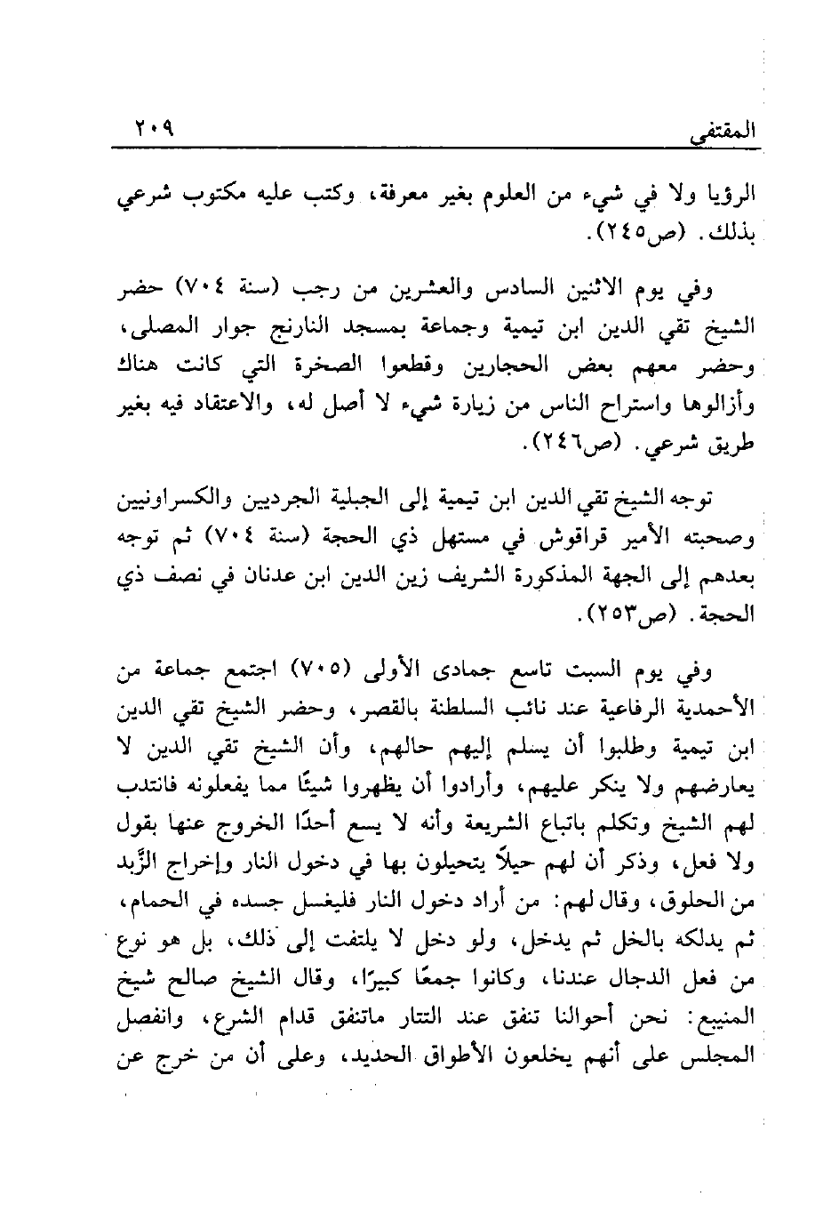 وفي يوم السبت تاسع جمادى الأولى (705) اجتمع جماعة من الأحمدية الرفاعية عند نائب السلطنة بالقصر، وحضر الشيخ تقي الدين ابن تيمية وطلبوا أن يسلم إليهم حالهم، وأن الشيخ تقي الدين لا يعارضهم ولا ينكر عليهم، وأرادوا أن يظهروا شيئًا مما يفعلونه فانتدب لهم الشيخ وتكلم باتباع الشريعة وأنه لا يسع أحدًا الخروج عنها بقول ولا فعل، وذكر أن لهم حيلاً يتحيلون بها في دخول النار وإخراج الزَّبد من الحلوق، وقال لهم: من أراد دخول النار فليغسل جسده في الحمام، ثم يدلكه بالخل ثم يدخل، ولو دخل لا يلتفت إلى ذلك، بل هو نوع من فعل الدجال عندنا، وكانوا جمعًا كبيرًا، وقال الشيخ صالح شيخ المنيبع: نحن أحوالنا تنفق عند التتار ماتنفق قدام الشرع، وانفصل المجلس على أنهم يخلعون الأطواق الحديد، وعلى أن من خرج عن