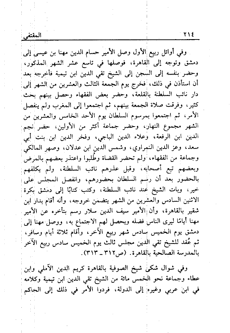 وفي أوائل ربيع الأول وصل الأمير حسام الدين مهنا بن عيسى إلى دمشق وتوجه إلى القاهرة، فوصلها في تاسع عشر الشهر المذكور، وحضر بنفسه إلى السجن إلى الشيخ تقي الدين ابن تيمية فأخرجه بعد أن استأذن في ذلك، فخرج يوم الجمعة الثالث والعشرين من الشهر إلى دار نائب السلطنة بالقلعة، وحضر بعض الفقهاء وحصل بينهم بحث كثير، وفرقت صلاة الجمعة بينهم، ثم اجتمعوا إلى المغرب ولم ينفصل الأمر، ثم اجتمعوا بمرسوم السلطان يوم الأحد الخامس والعشرين من الشهر مجموع النهار، وحضر جماعة أكثر من الأولين، حضر نجم الدين ابن الرفعة، وعلاء الدين الباجي، وفخر الدين ابن بنت أبي سعد، وعز الدين النمراوي، وشمس الدين ابن عدلان، وصهر المالكي وجماعة من الفقهاء، ولم تحضر القضاة وطُلبوا واعتذر بعضهم بالمرض وبعضهم تبع أصحابه، وقبل عذرهم نائب السلطنة، ولم يكلفهم بالحضور بعد أن رسم السلطان بحضورهم، وانفصل المجلس على خير، وبات الشيخ عند نائب السلطنة، وكتب كتابًا إلى دمشق بكرة الاثنين السادس والعشرين من الشهر يتضمن خروجه، وأنه أقام بدار ابن شقير بالقاهرة، وأن الأمير سيف الدين سلار رسم بتأخره عن الأمير مهنا أيامًا ليرى الناس فضله ويحصل لهم الاجتماع به، ووصل مهنا إلى دمشق يوم الخميس سادس شهر ربيع الآخر، وأقام ثلاثة أيام وسافر، ثم عُقد للشيخ تقي الدين مجلس ثالث يوم الخميس سادس ربيع الآخر بالمدرسة الصالحية بالقاهرة. (ص 312 - 313).