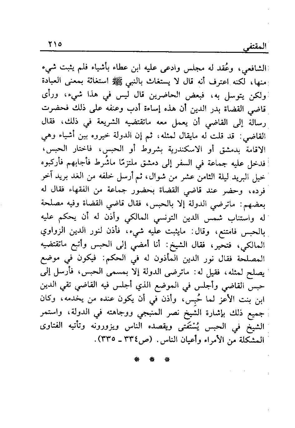 الشافعي، وعُقد له مجلس وادعى عليه ابن عطاء بأشياء فلم يثبت شيء منها، لكنه اعترف أنه قال لا يستغاث بالنبي صلى الله عليه وسلم استغاثة بمعنى العبادة ولكن يتوسل به، فبعض الحاضرين قال ليس في هذا شيء، ورأى قاضي القضاة بدر الدين أن هذه إساءة أدب وعنفه على ذلك فحضرت رسالة إلى القاضي أن يعمل مع ماتقتضيه الشريعة في ذلك، فقال القاضي: قد قلت له مايقال لمثله، ثم إن الدولة خيروه بين أشياء وهي الاقامة بدمشق أو الاسكندرية بشروط أو الحبس، فاختار الحبس، فدخل عليه جماعة في السفر إلى دمشق ملتزمًا ماشُرط فأجابهم فأركبوه خيل البريد ليلة الثامن عشر من شوال، ثم أرسل خلفه من الغد بريد آخر فرده، وحضر عند قاضي القضاة بحضور جماعة من الفقهاء فقال له بعضهم: ماترضى الدولة إلا بالحبس، فقال قاضي القضاة وفيه مصلحة له واستناب شمس الدين التونسي المالكي وأذن له أن يحكم عليه بالحبس فامتنع، وقال: مايثبت عليه شيء، فأذن لنور الدين الزواوي المالكي، فتحير، فقال الشيخ: أنا أمضي إلى الحبس وأتبع ماتقتضيه المصلحة فقال نور الدين المأذون له في الحكم: فيكون في موضع يصلح لمثله، فقيل له: ماترضى الدولة إلا بمسمى الحبس، فأرسل إلى حبس القاضي وأجلس في الموضع الذي أجلس فيه القاضي تقي الدين ابن بنت الأعز لما حُبِس، وأذن في أن يكون عنده من يخدمه، وكان جميع ذلك بإشارة الشيخ نصر المنبجي ووجاهته في الدولة، واستمر الشيخ في الحبس يُسْتَفتى ويقصده الناس ويزورونه وتأتيه الفتاوى المشكلة من الأمراء وأعيان الناس. (ص 334 - 335).