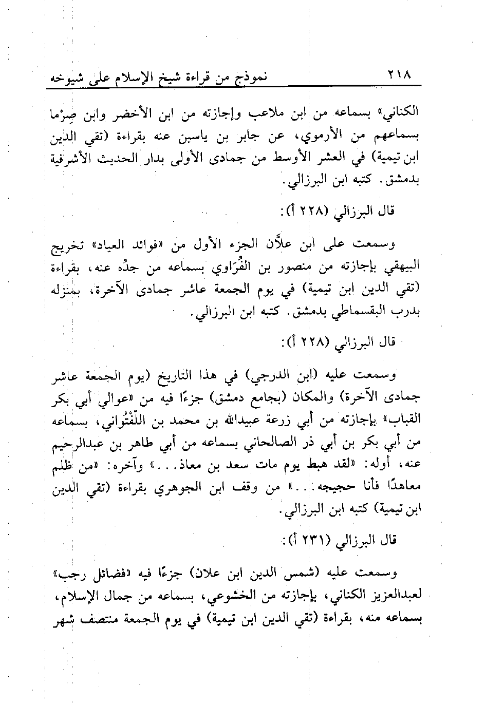 وسمعت على ابن علاَّن الجزء الأول من «فوائد العياد» تخريج البيهقي بإجازته من منصور بن الفُرَاوي بسماعه من جدِّه عنه، بقراءة (تقي الدين ابن تيمية) في يوم الجمعة عاشر جمادى الآخرة، بمنزله بدرب البقسماطي بدمشق. كتبه ابن البرزالي.