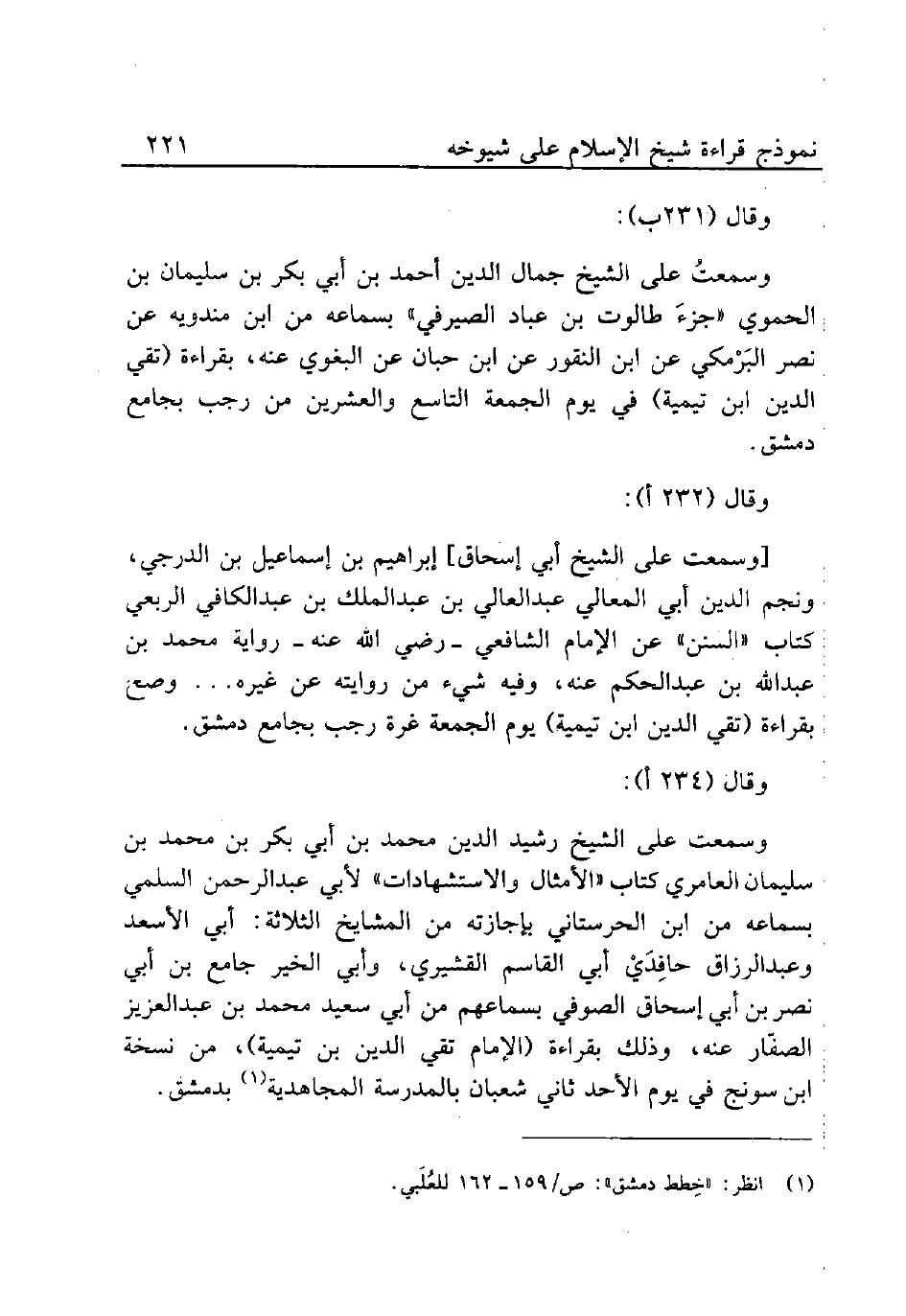 وسمعت على الشيخ رشيد الدين محمد بن أبي بكر بن محمد بن سليمان العامري كتاب «الأمثال والاستشهادات» لأبي عبد الرحمن السلمي بسماعه من ابن الحرستاني بإجازته من المشايخ الثلاثة: أبي الأسعد وعبد الرزاق حافِدَيْ أبي القاسم القشيري، وأبي الخير جامع بن أبي نصر بن أبي إسحاق الصوفي بسماعهم من أبي سعيد محمد بن عبد العزيز الصفّار عنه، وذلك بقراءة (الإمام تقي الدين ابن تيمية)، من نسخة ابن سونج في يوم الأحد ثاني شعبان بالمدرسة المجاهدية (¬1) بدمشق.