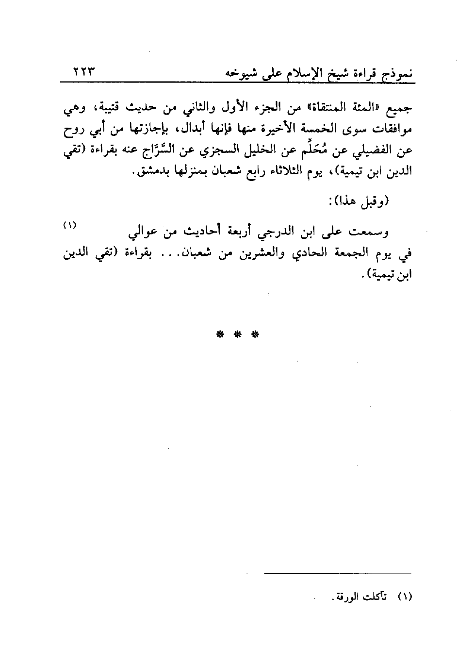 وسمعت على ابن الدرجي أربعة أحاديث من عوالي (¬1) في يوم الجمعة الحادي والعشرين من شعبان. . . بقراءة (تقي الدين ابن تيمية).