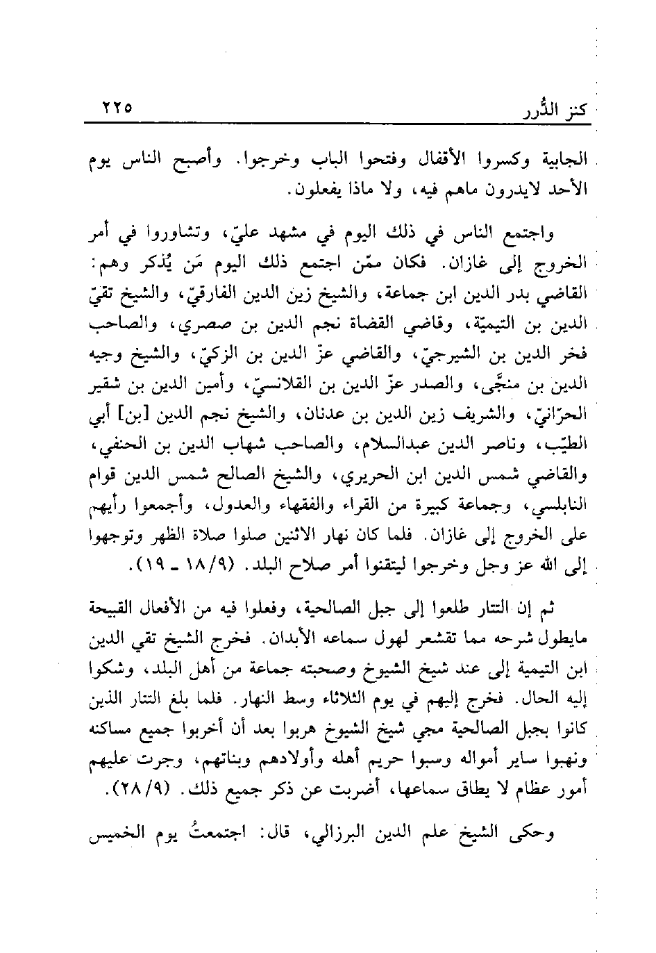 واجتمع الناس في ذلك اليوم في مشهد عليّ، وتشاوروا في أمر الخروج إلى غازان. فكان ممّن اجتمع ذلك اليوم مَن يُذكر وهم: القاضي بدر الدين ابن جماعة، والشيخ زين الدين الفارقيّ، والشيخ تقيّ الدين ابن التيميّة، وقاضي القضاة نجم الدين بن صصري، والصاحب فخر الدين بن الشيرجيّ، والقاضي عزّ الدين بن الزكيّ، والشيخ وجيه الدين بن منجَّي، والصدر عزّ الدين بن القلانسيّ، وأمين الدين بن شقير الحرّانيّ، والشريف زين الدين بن عدنان، والشيخ نجم الدين [بن] أبي الطيّب، وناصر الدين عبد السلام، والصاحب شهاب الدين بن الحنفي، والقاضي شمس الدين ابن الحريري، والشيخ الصالح شمس الدين قوام النابلسي، وجماعة كبيرة من القراء والفقهاء والعدول، وأجمعوا رأيهم على الخروج إلى غازان. فلما كان نهار الاثنين صلوا صلاة الظهر وتوجهوا إلى الله عز وجل وخرجوا ليتقنوا أمر صلاح البلد. (9/ 18 - 19).