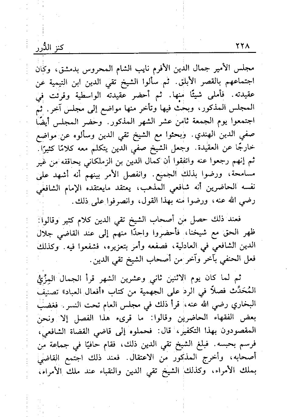 مجلس الأمير جمال الدين الأفرم نايب الشام المحروس بدمشق، وكان اجتماعهم بالقصر الأبلق. ثم سألوا الشيخ تقي الدين ابن التيمية عن عقيدته. فأملى شيئًا منها. ثم أحضر عقيدته الواسطية وقرئت في المجلس المذكور، وبحث فيها وتأخر منها مواضع إلى مجلس آخر. ثم اجتمعوا يوم الجمعة ثامن عشر الشهر المذكور. وحضر المجلس أيضًا صفي الدين الهندي. وبحثوا مع الشيخ تقي الدين وسألوه عن مواضع خارجًا عن العقيدة. وجعل الشيخ صفي الدين يتكلم معه كلامًا كثيرًا ثم إنهم رجعوا عنه واتفقوا أن كمال الدين بن الزملكاني يحاققه من غير مسامحة، ورضوا بذلك الجميع. وانفصل الأمر بينهم أنه أشهد على نفسه الحاضرين أنه شافعي المذهب، يعتقد مايعتقده الإمام الشافعي رضي الله عنه، ورضوا منه بهذا القول، وانصرفوا على ذلك.