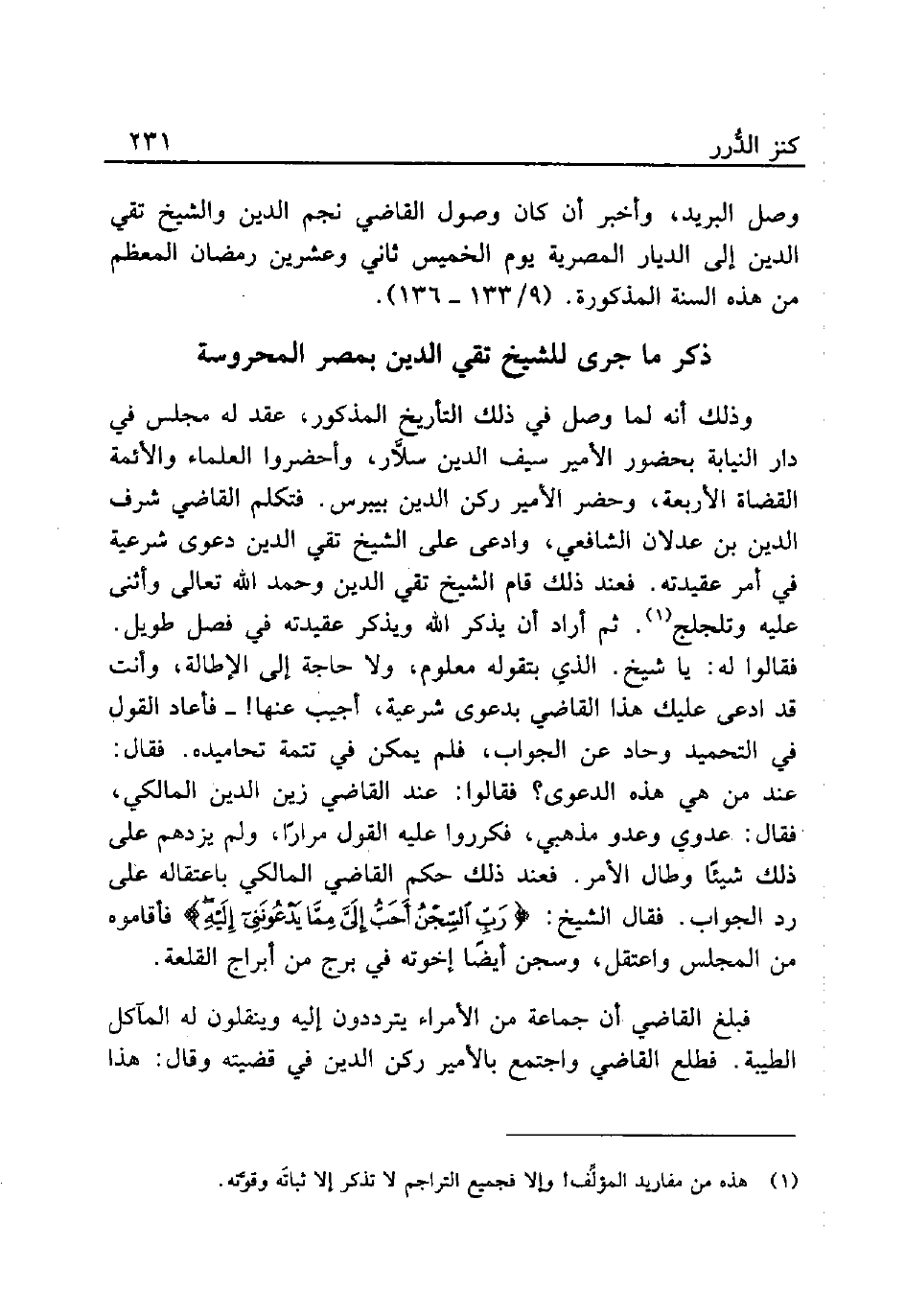 وذلك أنه لما وصل في ذلك التاريخ المذكور، عقد له مجلس في دار النيابة بحضور الأمير سيف الدين سلاَّر، وأحضروا العلماء والأئمة القضاة الأربعة، وحضر الأمير ركن الدين بيبرس. فتكلم القاضي شرف الدين بن عدلان الشافعي، وادعى على الشيخ تقي الدين دعوى شرعية في أمر عقيدته. فعند ذلك قام الشيخ تقي الدين وحمد الله تعالى وأثنى عليه وتلجلج (¬1). ثم أراد أن يذكر الله ويذكر عقيدته في فصل طويل. فقالوا له: يا شيخ. الذي بتقوله معلوم، ولا حاجة إلى الإطالة، وأنت قد ادعى عليك هذا القاضي بدعوى شرعية، أجيب عنها! - فأعاد القول في التحميد وحاد عن الجواب، فلم بمكن في تتمة تحاميده. فقال: عند من هي هذه الدعوى؟ فقالوا: عند القاضي زين الدين المالكي، فقال: عدوي وعدو مذهبي، فكرروا عليه القول مرارًا، ولم يزدهم على ذلك شيئًا وطال الأمر. فعند ذلك حكم القاضي المالكي باعتقاله على رد الجواب. فقتال الشيخ: {رَبِّ السِّجْنُ أَحَبُّ إِلَيَّ مِمَّا يَدْعُونَنِي إِلَيْهِ} فأقاموه من المجلس واعتقل، وسجن أيضًا إخوته في برج من أبراج القلعة.