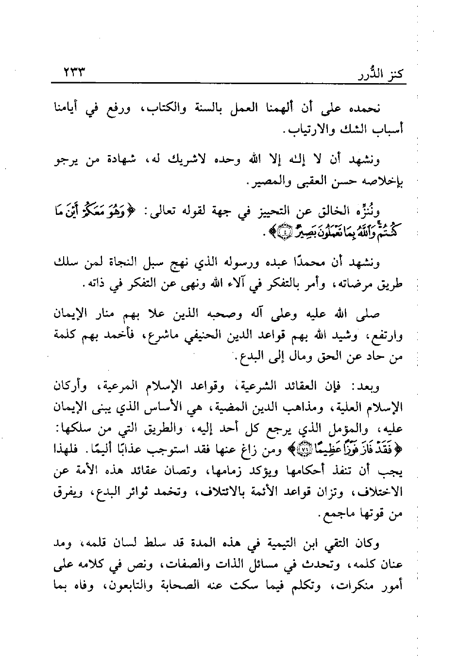 وبعد: فإن العقائد الشرعية، وقواعد الإسلام المرعية، وأركان الإسلام العلية، ومذاهب الدين المضية، هي الأساس الذي يبني الإيمان عليه، والمؤمل الذي يرجع كل أحد إليه، والطريق التي من سلكها: {فَقَدْ فَازَ فَوْزًا عَظِيمًا (71)} ومن زاغ عنها فقد استوجب عذابًا أليمًا. فلهذا يجب أن تنفذ احكامها ويؤكد زمامها، وتصان عقائد هذه الأمة عن الاختلاف، وتزان قواعد الأمة بالائتلاف، وتخمد ثوائر البدع، ويفرق من قوتها ماجمع.