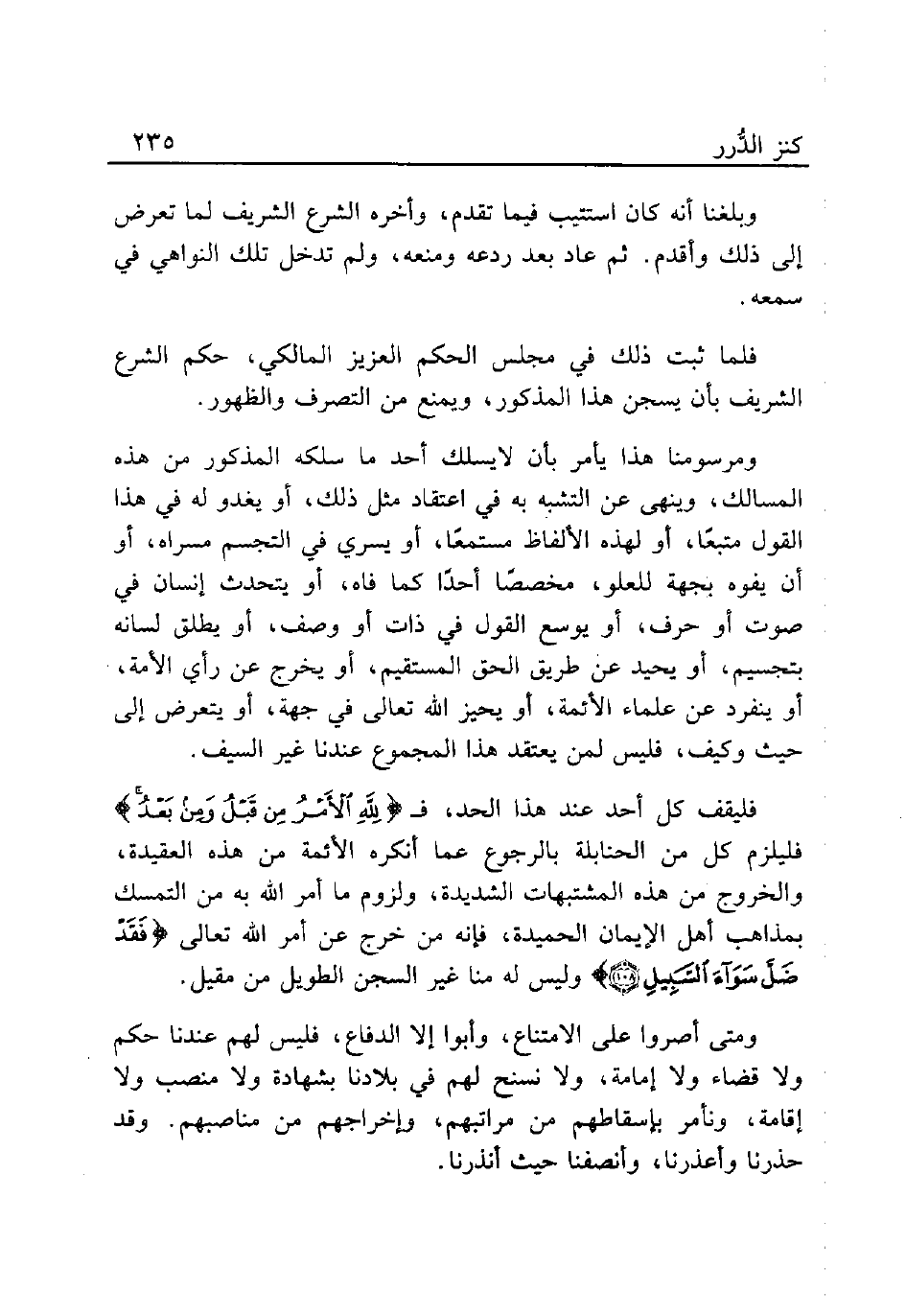 ومرسومنا هذا يأمر بأن لايسلك أحد ما سلكه المذكور من هذه المسالك، وينهى عن التشبه به في اعتقاد مثل ذلك، أو يغدو له في هذا القول متبعًا، أو لهذه الألفاظ مستمعًا، أو يسري في التجسيم مسراه، أو أن يفوه بجهة للعلو، مخصصًا أحدًا كما فاه، أو يتحدث إنسان في صوت أو حرف، أو يوسع القول في ذات أو وصف، أو يطلق لسانه بتجسيم، أو يحيد عن طريق الحق المستقيم، أو يخرج عن رأي الأمة، أو ينفرد عن علماء الأئمة، أو يحيز الله تعالى في جهة، أو يتعرض إلى حيث وكيف، فليس لمن يعتقد هذا المجموع عندنا غير السيف.