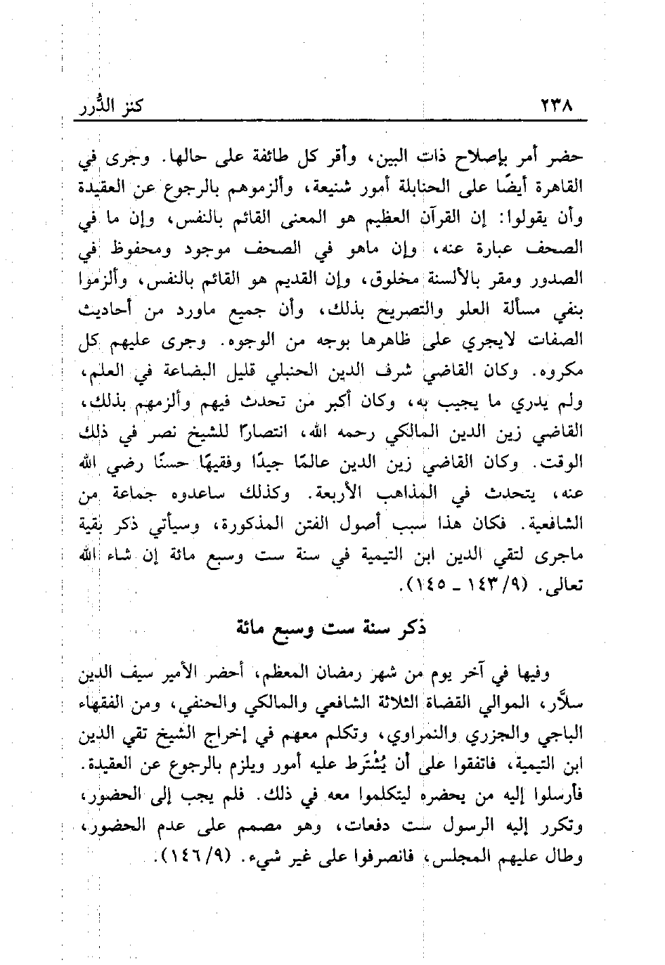 حضر أمر بإصلاح ذات البين، وأقر كل طائفة على حالها. وجرى في القاهرة أيضًا على الحنابلة أمور شنيعة، وألزموهم بالرجوع عن العقيدة وأن يقولوا: إن القرآن العظيم هو المعنى القائم بالنفس، وإن ما في الصحف عبارة عنه، وإن ماهو في الصحف موجود ومحفوظ في الصدور ومقر بالألسنة مخلوق، وإن القديم هو القائم بالنفس، وألزموا بنفي مسألة العلو والتصريح بذلك، وأن جميع ماورد من أحاديث الصفات لايجري على ظاهرها بوجه من الوجوه. وجرى عليهم كل مكروه. وكان القاضي شرف الدين الحنبلي قليل البضاعة في العلم، ولم يدري ما يجيب به، وكان أكبر من تحدث فيهم وألزمهم بذلك، القاضي زين الدين المالكي رحمه الله، انتصارًا للشيخ نصر في ذلك الوقت. وكان القاضي زين الدين عالمًا جيدًا وفقيهًا حسنًا رضي الله عنه، يتحدث في المذاهب الأربعة. وكذلك ساعدوه جماعة من الشافعية. فكان هذا سبب أصول الفتن المذكورة، وسيأتي ذكر بقية ماجرى لتقي الدين ابن التيمية في سنة ست وسبع مائة إن شاء الله تعالى. (9/ 143 - 145).