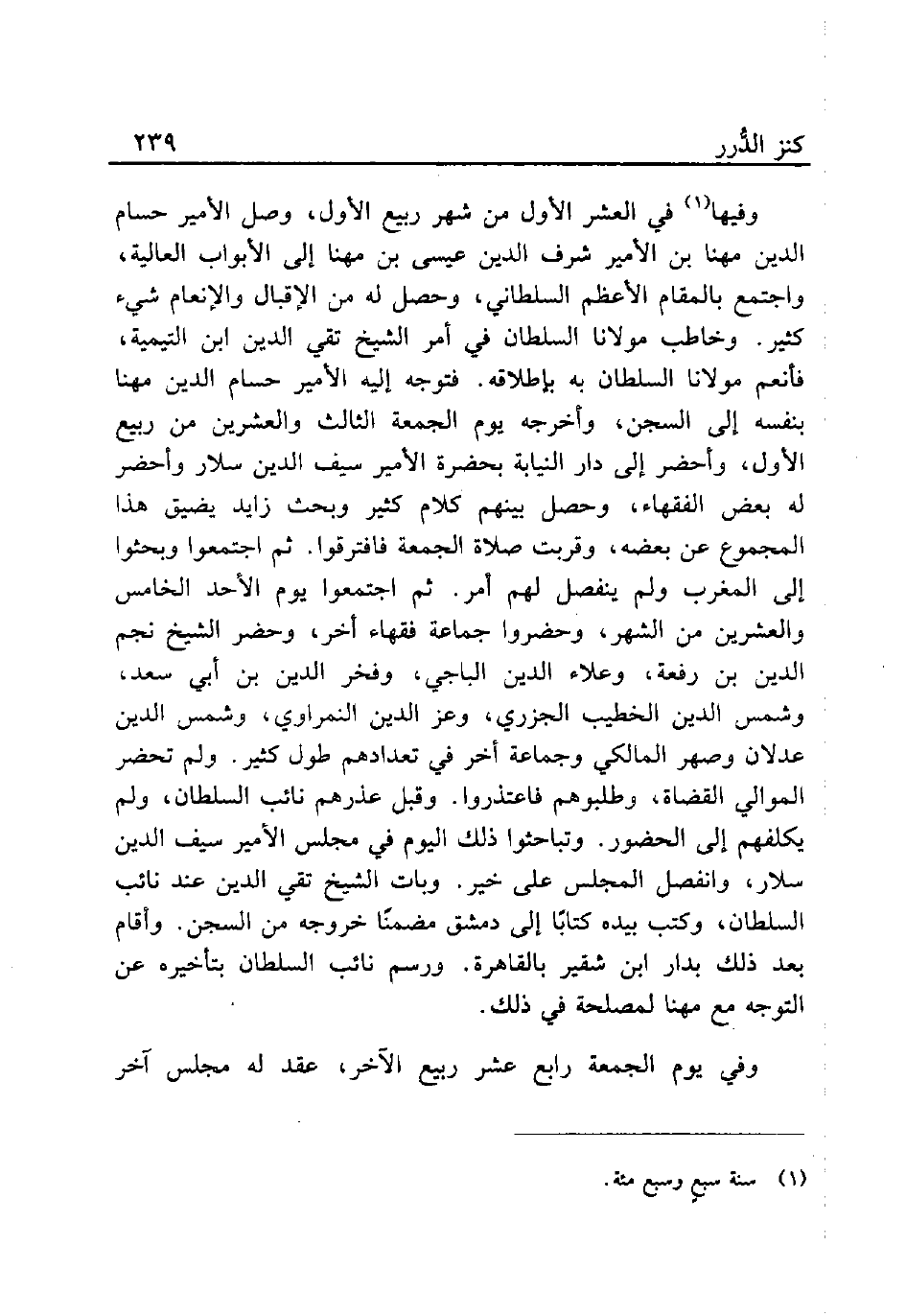 وفيها (¬1) في العشر الأوائل من شهر ربيع الأول، وصل الأمير حسام الدين مهنا بن الأمير شرف الدين عيسى بن مهنا إلى الأبواب العالية، واجتمع بالمقام الأعظم السلطاني، وحصل له من الإقبال والإنعام شيء كثير. وخاطب مولانا السلطان في أمر الشيخ تقي الدين ابن التيمية، فأنعم مولانا السلطان به بإطلاقه. فتوجه إليه الأمير حسام الدين مهنا بنفسه إلى السجن، وأخرجه يوم الجمعة الثالث والعشرين من ربيع الأول، وأحضر إلى دار النيابة بحضرة الأمير سيف الدين سلار وأحضر له بعض الفقهاء، وحصل بينهم كلام كثير وبحث زايد يضيق هذا المجموع عن بعضه، وقربت صلاة الجمعة فافترقوا. ثم اجتمعوا وبحثوا إلى المغرب ولم ينفصل لهم أمر. ثم اجتمعوا يوم الأحد الخامس والعشرين من الشهر، وحضروا جماعة فقهاء أخر، وحضر الشيخ نجم الدين بن رفعة، وعلاء الدين الباجي، وفخر الدين بن أبي سعد، وشمس الدين الخطيب الجزري، وعز الدين النمراوي، وشمس الدين عدلان وصهر المالكي وجماعة أخر في تعدادهم طول كثير. ولم تحضر الموالي القضاة، وطلبوهم فاعتذروا. وقبل عذرهم نائب السلطان، ولم يكلفهم إلى الحضور. وتباحثوا في ذلك اليوم في مجلس الأمير سيف الدين سلار، وانفصل المجلس على خير. وبات الشيخ تقي الدين عند نائب السلطان، وكتب بيده كتابًا إلى دمشق مضمنًا خروجه من السجن. وأقام بعد ذلك بدار ابن شقير بالقاهرة. ورسم نائب السلطان بتأخيره عن التوجه مع مهنا لمصلحة في ذلك.