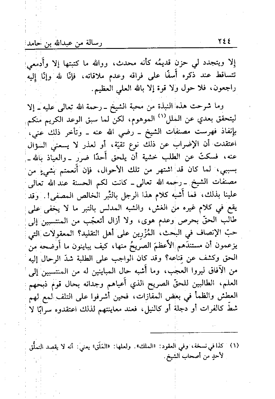 وما شرحت هذه النبذة من محبة الشيخ - رحمة الله تعالى عليه - إلا ليتحقق بعدي عن الملل (¬1) الموهوم، لكن لما سبق الوعد الكريم منكم بإِنفاذ فهرست مصنفات الشيخ - رضي الله عنه - وتأخر ذلك عني، اعتقدت أن الإضراب عن ذلك نوع تقيّة، أو لعذر لا يسعني السؤال عنه، فسكتّ عن الطلب خشية أن يلحق أَحدَا ضرر - والعياذ بالله - بسببي، لما كان قد اشتهر في تلك الأحوال، فإن أَنعمتم بشيءٍ من مصنفات الشيخ - رحمه الله تعالى - كانت لكم الحسنة عند الله تعالى علينا بذلك، فما أَشبه كلام هذا الرجل بالتِّبر الخالص المصفى!. وقد يقع في كلام غيره من الغش، والشبه المدلس بالتبر ما لا يخفى على طالب الحقّ بحرص وعدم هوى، ولا أزال أتعجّب من المنتسبين إلى حبّ الإنصاف في البحث، المُزْرِين على أهل التقليد؟ المعقولات التي يزعمون أن مستندَهم الأَعظمَ الصريحُ منها، كيف يباينون ما أَوضحه من الحق وكشف عن قِناعه؟ وقد كان الواجب على الطلبة شدّ الرحال إليه من الآفاق ليرو العجب، وما أَشبه حال المباينين له من المنتسبين إلى العلم، الطالبين للحقّ الصريح الذي أَعياهم وجدانه بحال قوم ذبحهم العطش والظمأ في بعض المفازات، فحين أشرفوا على التلف لمع لهم شطّ كالفرات أو دجلة أو كالنيل، فعند معاينتهم لذلك اعتقدوه سرابًا لا