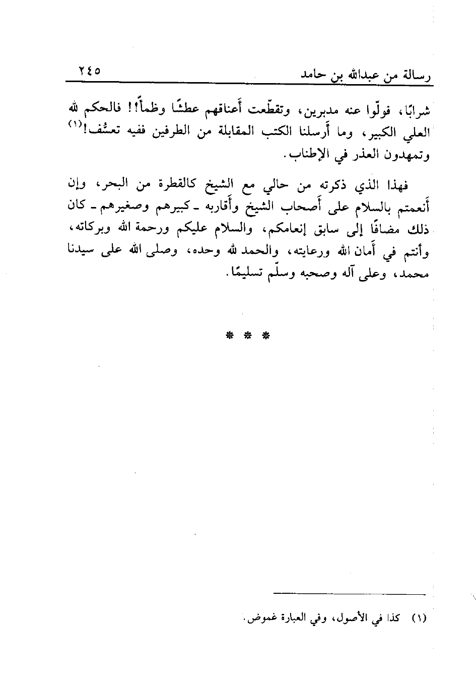شرابًا، فولّوا عنه مدبرين، وتقطّعت أَعناقهم عطشًا وظمأً!! فالحكم لله العلي الكبير، وما أَرسلنا الكتب المقابلة من الطرفين ففيه تعسُّف! (¬1) وتمهدون العذر في الإطناب.