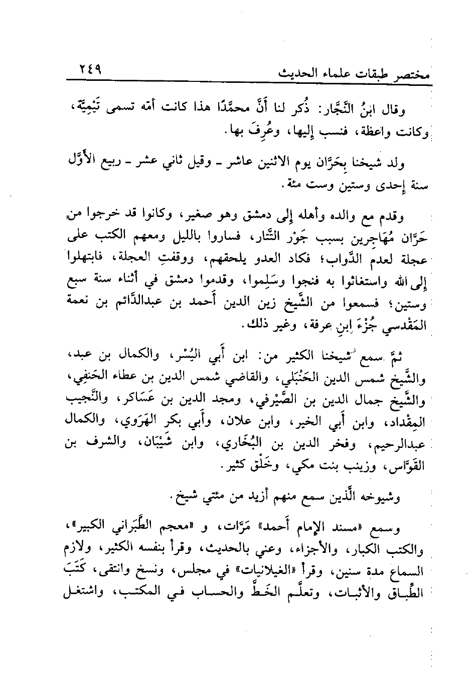 وقدم مع والده وأهله إِلى دمشق وهو صغير، وكانوا قد خرجوا من حَرَّان مُهَاجِرين بسنن جَوْر التَّتار، فساروا بالليل ومعهم الكتب على عجلة لعدم الدَّواب؛ فكاد العدو يلحقهم، ووقفتِ العجلة، فابتهلوا إِلى الله واستغاثوا به فنجوا وسَلِموا، وقدموا دمشق في أثناء سنة سبع وستين؛ جُزْءَ ابنِ عرفة، وغير ذلك.