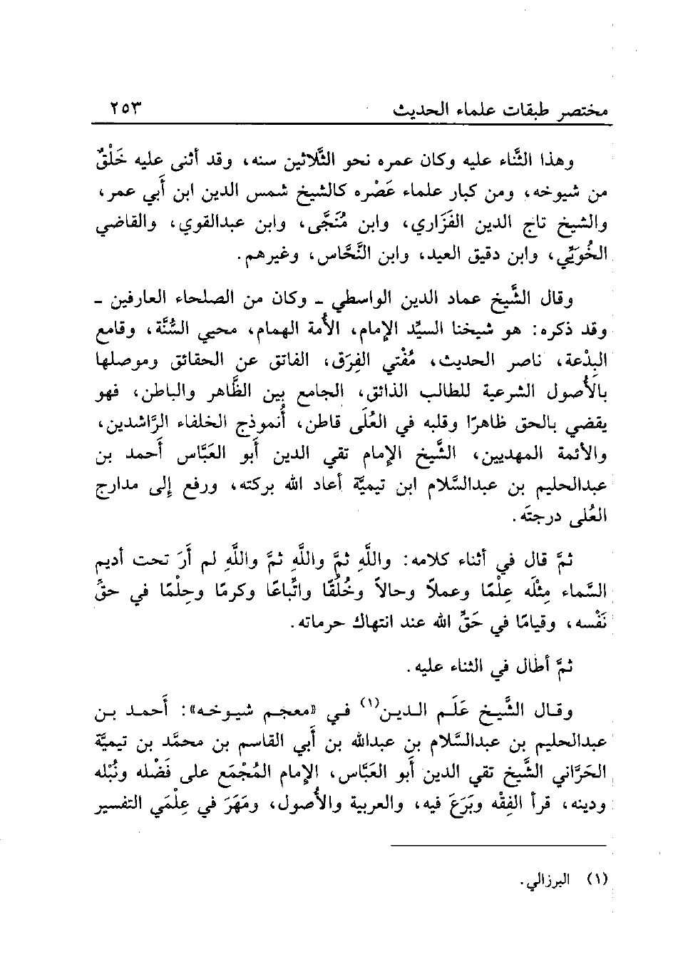 وقال الشَّيخ عَلَم الدين (¬1) في «معجم شيوخه»: أَحمد بن عبد الحليم بن عبد السَّلام بن عبد الله بن أَبي القاسم بن محمَّد بن تيميَّة الحَرَّاني الشَّيخ تقي الدين أَبو العَبَّاس، الإِمام المُجْمَع على فَضْله ونُبْله ودينه، قرأ الفِقْه وبَرَعَ فيه، والعربية والأُصول، ومَهَرَ في عِلْمَي التفسير