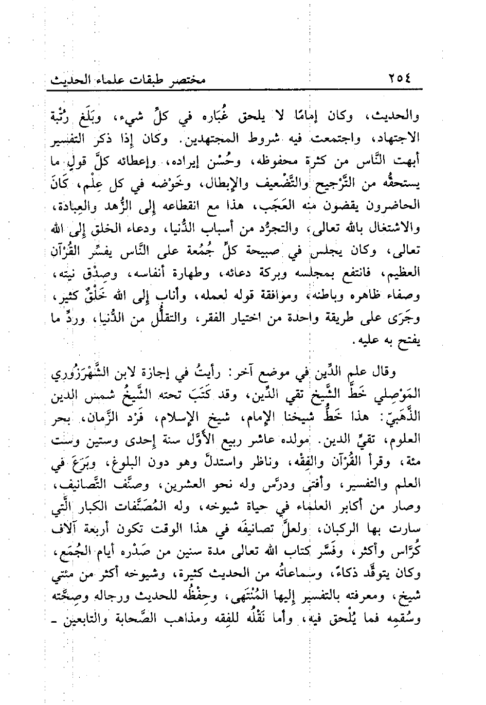 وقال علم الدِّين في موضع آخر: رأيتُ في إجازة لابن الشَّهْرَزُوري المَوْصِلي خَطَّ الشَّيخ تقي الدِّين، وقد كَتَبَ تحته الشَّيخُ شمس الدين الذَّهَبيّ: هذا خَطُّ شيخنا الإِمام، شيخ الإِسلام، فَرْد الزَّمان، بحر العلوم، تقيِّ الدين. مولده عاشر ربيع الأَوَّل سنة إِحدى وستين وست مئة، وقرأ القُرْآن والفِقْه، وناظر استدلَّ وهو دون البلوغ، وبَرَعَ في العلم والتفسير، وأفتى ودرَّس وله نحو العشرين، وصنَّف التَّصانيف، وصار من أكابر العلماء في حياة شيوخه، وله المُصَنَّفات الكبار الَّتي سارت بها الركبان، ولعلَّ تصانيفَه في هذا الوقت تكون أربعة آلاف كُرَّاس وأكثر، وفَسَّر كتاب الله تعالى مدة سنين من صَدْره أيام الجُمَع، وكان يتوقَّد ذكاءً، وسماعاتُه من الحديث كثيرة، وشيوخه أكثر من مئتي شيخ، ومعرفته بالتفسير إِليها المُنْتَهى، وحِفْظُه للحديث ورجاله وصِحَّته وسُقمِه فما يُلْحق فيه، وأما نَقْلُه للفِقه ومذاهب الصَّحابة والتابعين -
