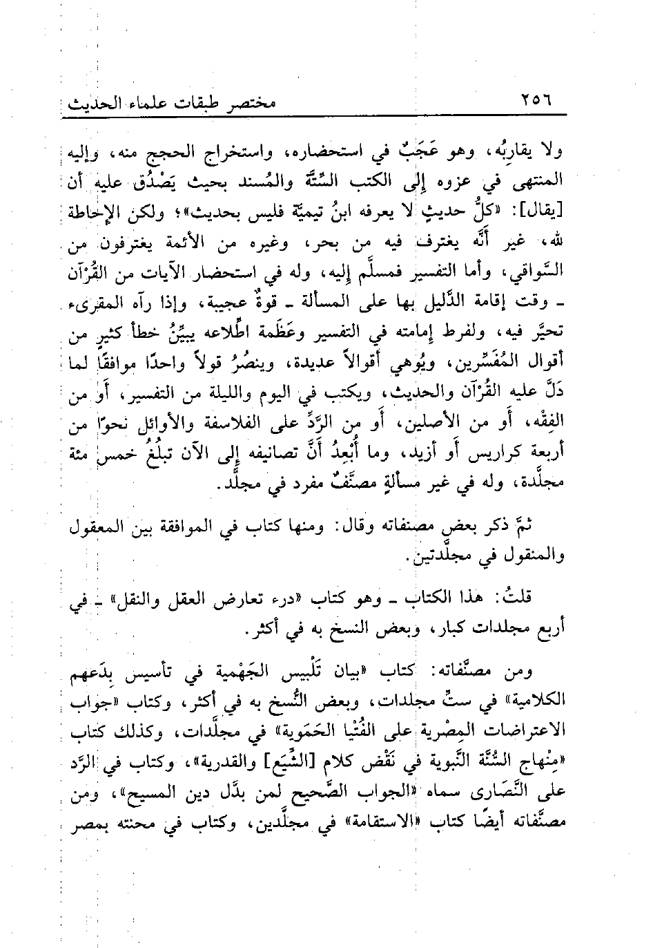 ولا يُقارِبه، وهو عَجَبٌ في استحضاره، واستخراج الحجج منه، وإليه المنتهى في عزوه إِلى الكتب السِّتَّة والمُسند بحيث يَصْدُق عليه أن [يقال]: «كلُّ حديثٍ لا يعرفه ابنُ تيميَّة فليس بحديث»؛ ولكن الإِحاطة لله، غير أَنَّه يغترف فيه من بحر، وغيره من الأئمة يغترفون من السَّواقي، وأما التفسير فمسلَّم إِليه، وله في استحضار الآيات من القُرْآن - وقت إقامة الدَّليل بها على المسألة - قوةٌ عجيبة، وإذا رآه المقرئ تحيَّر فيه، ولفرط إِمامته في التفسير وعَظَمة اطِّلاعه يبيِّنُ خطأ كثيرٍ من أقوال المُفَسِّرين، ويُوهي أقوالاً عديدة، وينصُرُ قولاً واحدًا موافقًا لما دَلَّ عليه القُرْآن والحديث، ويكتب في اليوم والليلة من التفسير، أَو من الفِقْه، أَو من الأصلين، أَو من الرَّدِّ على الفلاسفة والأوائل نحوًا من أربعة كراريس أَو أزيد، وما أُبْعِدُ أَنَّ تصانيفه إِلى الآن تبلُغُ خمس مئة مجلَّدة، وله في غير مسألةٍ مصنَّفٌ مفرد في مجلَّد.
