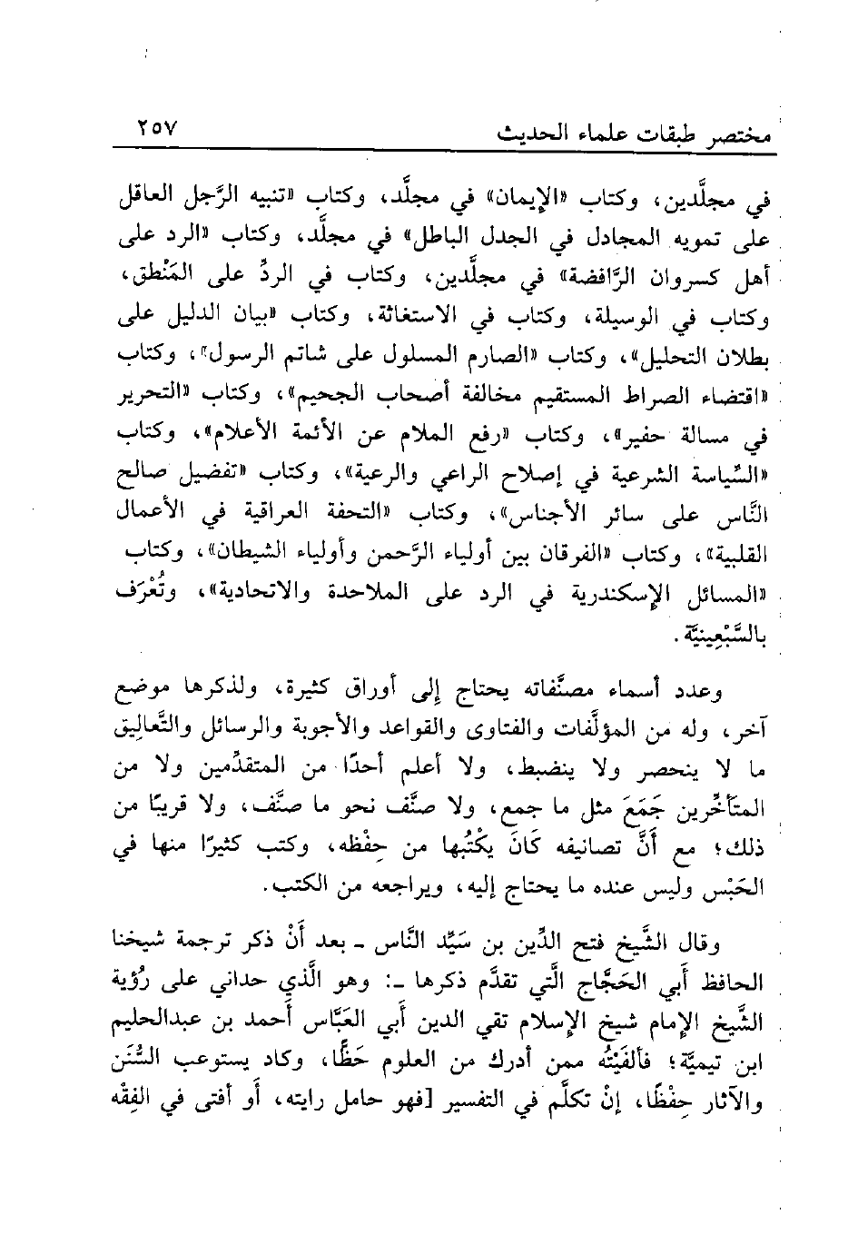 وعدد أسماء مصنَّفاته يحتاج إِلى أوراق كثيرة، ولذكرها موضع آخر، وله من المؤلَّفات والفتاوى والقواعد والأجوبة والرسائل والتَّعالِيق ما لا ينحصر ولا ينظبط، ولا أعلم أحدًا من المتقدِّمين ولا من المتَأخِّرين جَمَعَ مثل ما جمع، ولا صنَّف نحو ما صنَّف، ولا قريبًا من ذلك؛ مع أَنَّ تصانيفه كَانَ يكْتُبها من حِفْظه، وكتب كثيرًا منها في الحَبْس وليس عنده ما يحتاج إليه، ويراجعه من الكتب.