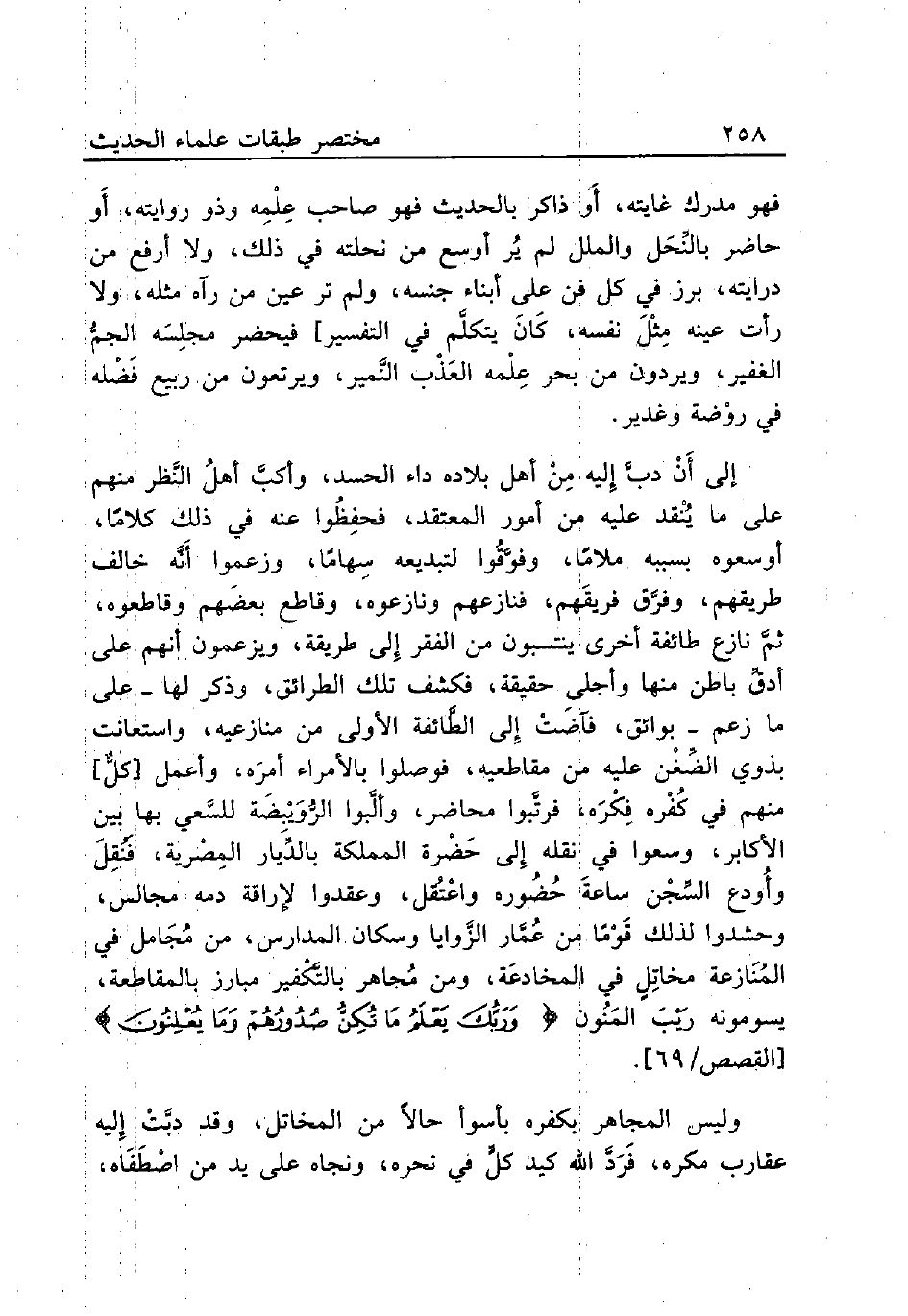 فهو مدرك غايته، أَو ذاكر بالحديث فهو صاحب عِلْمِه وذو روايته، أَو حاضر بالنِّحَل والملل لم يُر أوسع من نحلته في ذلك، ولا أرفع من درايته، برز في كل فن على أبناء جنسه، ولم تر عين من رآه مثله، ولا رأت عينه مِثْلَ نفسه، كَانَ يتكلَّم في التفسير] فيحضر مجلِسَه الجمُّ الغفير، ويردون من بحر عِلْمه العَذْب النَّمير، ويرتعون من ربيع فَضْله في روْضة وغدير.