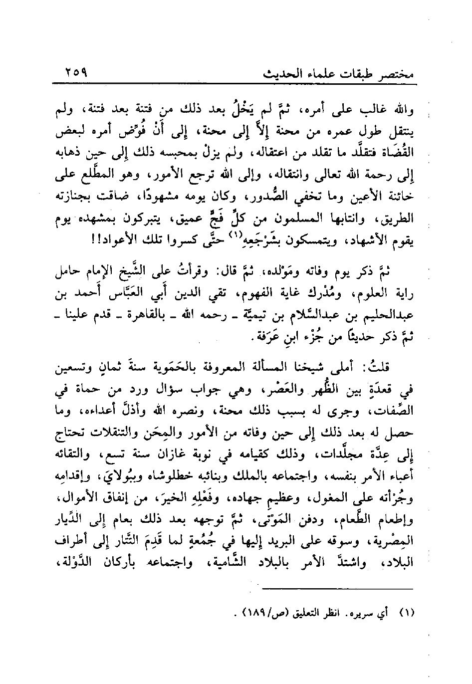 قلتُ: أملى شيخنا المسألة المعروفة بالحَمَوية سنةَ ثمانٍ وتسعين في قعدَةٍ بين الظُّهر والعَصْر، وهي جواب سؤال ورد من حماة في الصِّفات، وجرى له بسبب ذلك محنة، ونصره الله وأذلَّ أعداءه، وما حصل له بعد ذلك إِلى حين وفاته من الأمور والمِحَن والتنقلات تحتاج إِلى عِدَّة مجلَّدات، وذلك كقيامه في نوبة غازان سنة تسع، والتقائه أعباء الأمر بنفسه، واجتماعه بالملك وبنائه خطلوشاه وببُولايَ، وإقدامِه وجُرْأته على المغول، وعظيمِ جهاده، وفَعْلِهِ الخيرَ، من إنفاق الأموال، وإطعام الطَّعام، ودفن المَوْتى، ثمَّ توجهه بعد ذلك بعام إِلى الدِّيار المِصْرية، وسوقه على البريد إِليها في جُمُعةٍ لما قَدِمَ التَّتار إِلى أطراف البلاد، واشتدَّ الأمر بالبلاد الشَّامية، واجتماعه بأركان الدَّوْلة،