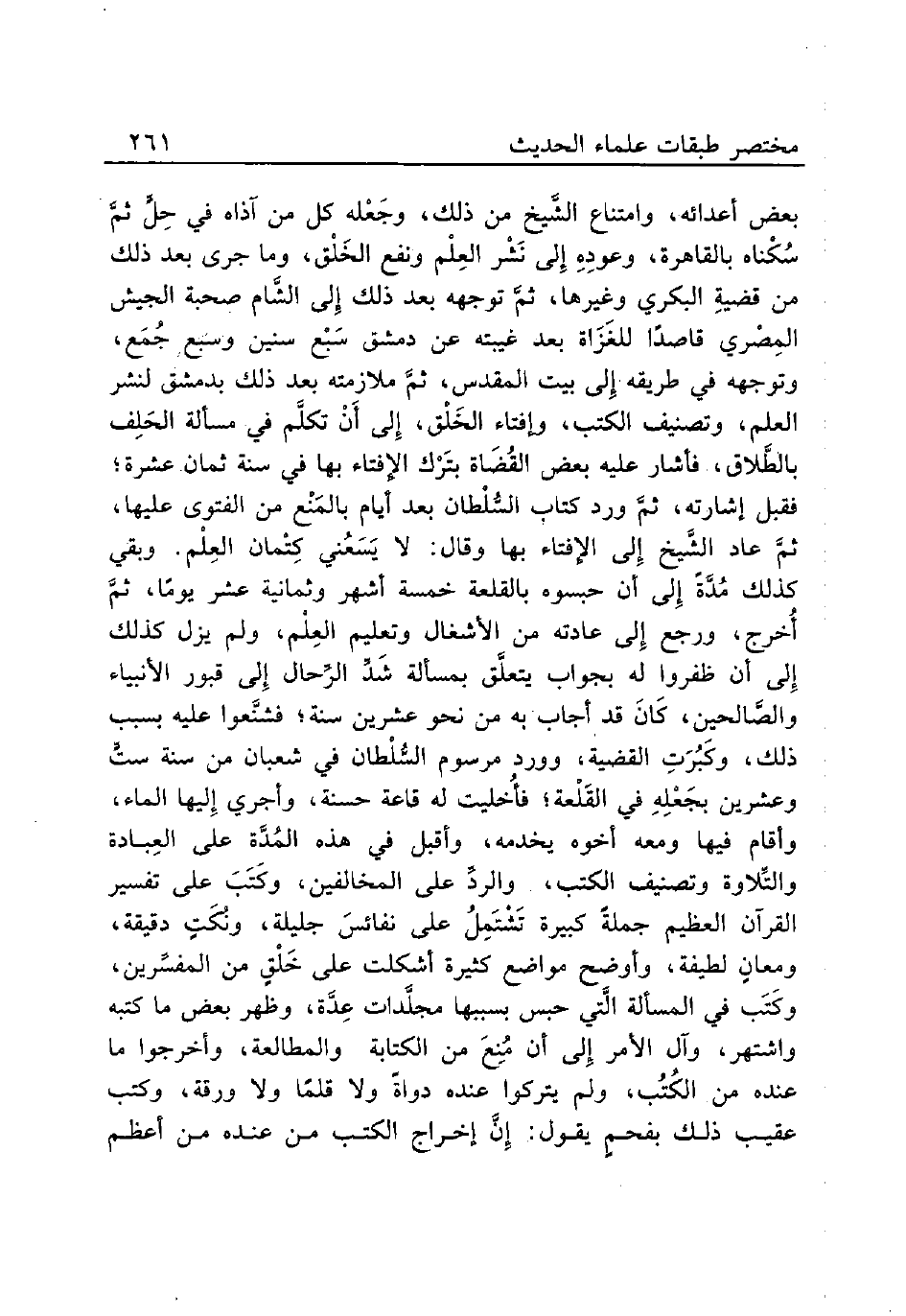 بعض أعدائه، وامتناع الشَّيخ من ذلك، وجَعْله كل من آذاه في حِلٍّ ثمَّ سُكْناه بالقاهرة، وعودِهِ إِلى نَشْر العِلْم ونفع الخَلْق، وما جرى بعد ذلك من قضيةِ البكري وغيرها، ثمَّ توجهه بعد ذلك إِلى الشَّام صحبة الجيش المِصْري قاصدًا للغَزَاة بعد غيبته عن دمشق سَبْع سنين وسبع جُمَع، وتوجهه في طريقه إِلى بيت المقدس، ثمَّ ملازمته بعد ذلك بدمشق لنشر العلم، وتصنيف الكتب، وإفتاء الخَلْق، إِلى أَنْ تكلَّم في مسألة الحَلِف بالطَّلاق، فأشار عليه بعض القُضَاة بتَرْك الإِفتاء بها في سنة ثمان عشرة؛ فقبل إشارته، ثمَّ ورد كتاب السُّلْطان بعد أيام بالمَنْع من الفتوى عليها، ثمَّ عاد الشَّيخ إِلى الإفتاء بها وقال: لا يَسَعُني كِتْمان العِلْم. وبقي كذلك مُدَّةً إِلى ان حبسوه بالقلعة خمسة أشهر وثمانية عشر يومًا، ثمَّ أُخرج، ورجع إِلى عادته من الأشغال وتعليم العِلْم، ولم يزل كذلك إِلى أن ظفروا له بجواب يتعلَّق بمسألة شَدِّ الرِّحال إِلى قبور الأنبياء والصَّالحين، كَانَ قد أجاب به من نحو عشرين سنة؛ وكَبُرَتِ القضية، وورد مرسوم السُّلْطان في شعبان من سنة ستٍّ وعشرين بجَعْلِهِ في القَلْعة؛ فأُخليت له قاعة حسنة، وأجري إِليها الماء، وأقام فيها ومعه أخوه يخدمه، وأقبل في هذه المُدَّة على العِبادة والتِّلاوة وتصنيف الكتب، والردِّ على المخالفين، وكَتَبَ على تفسير القرآن العظيم جملةً كبيرة تَشْتَمِلْ على نفائسَ جليلة، ونُكَتٍ دقيقة، ومعانٍ لطيفة، وأوضح مواضع كثيرة أشكلت على خَلْقٍ من المفسِّرين، وكَتَب في المسألة الَّتي حبس بسببها مجلَّدات عِدَّة، وظهر بعض ما كتبه واشتهر، وآل المر إِلى أن مُنِعَ من الكتابة والمطالعة، وأخرجوا ما عنده من الكُتُب، ولم يتركوا عنده دواةً ولا قلمًا ولا ورقة، وكتب عقيب ذلك بفحمٍ يقول: إِنَّ إخراج الكتب من عنده من أعظم