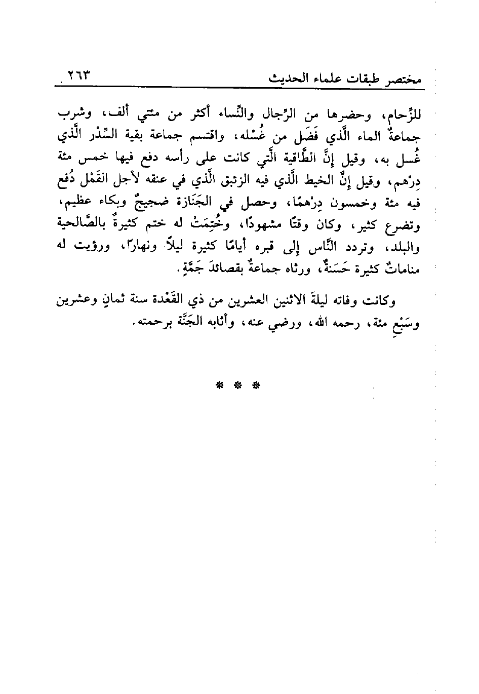 للزِّحام، وحضرها من الرِّجال والنِّساء أكثر من مئتي ألف، وشرب جماعةٌ الماء الَّذي فَضَل غُسْله، واجتمع جماعة بقية السِّدْر الَّذي غُسل به، وقيل إِنَّ الطَّاقية الَّتي كانت على رأسه دفع فيها خمسين مئة دِرْهم، وقيل إِنَّ الخيط الَّذي فيه الزئبق الَّذي في عنقه لأجل القّمْل دُفع فيه مئة وخمسون دِرْهَمًا، وحصل في الجَنَازة ضجيجٌ وبكاء عظيم، وتضرع كثير، وكان وقتًا مشهودًا، وخُتِمَتْ له ختم كثيرةٌ بالصَّالحية والبلد، وتردد النَّاس إِلى قبره أيامًا كثيرة ليلاً ونهارًا، ورؤيت له مناماتٌ كثيرة حَسَنةٌ، ورثاه جماعةٌ بقصائدَ جَمَّةٍ.