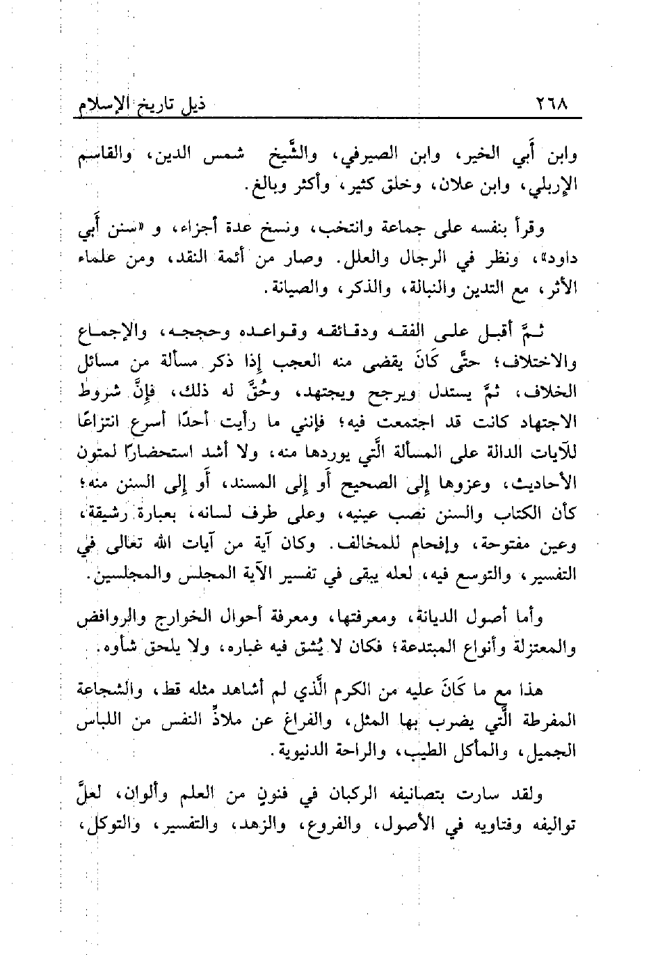 ثمَّ أقبل على الفقه ودقائقه وقواعده وحججه، والإجماع والاختلاف؛ حتَّى كَانَ يقضي منه العجب إِذا ذكر مسألة من مسائل الخلاف، ثمَّ يستدل ويرجع ويجتهد، وحُقَّ له ذلك، فإِنَّ شروط الاجتهاد كانت قد اجتمعت فيه؛ فإنني ما رأيت أحدًا أسرع انتزاعًا للآيات الدالة على المسألة الَّتي يوردها منه، ولا أشد استحضارًا لمتون الأحاديث، وعزوها إِلى الصحيح أَو إِلى المسند، أو إلى السنن منه؛ كأن الكتاب والسنن نصب عينيه، وعلى طرف لسانه، بعبارة رشيقة، وعين مفتوحة، وإفحام للمخالف. وكان آية من آيات الله تعالى في التفسير، والتوسع فيه، لعل يبقى في تفسير الآية المجلس والمجلسين.