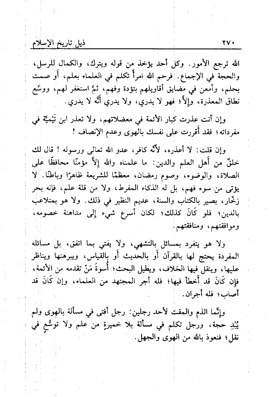 وإن قلت: لا أعذره، لأَنَّه كافر، عدو الله تعالى ورسوله! قال لك خلقٌ من أَهل العلم والدين: ما علمناه والله إِلاَّ مؤمنًا محافظًا على الصلاة، والوضوء، وصوم رمضان، معظمًا للشريعة ظاهرًا وباطنًا. لا يؤتى من سوء فهم، بل له الذكاء المفرط، ولا من قلة علم، فإنه بحر زخَّار، بصير بالكتاب والسنة، عديم النظير في ذلك. ولا هو بمتلاعب بالدين؛ فلو كَانَ كذلك؛ لكان أسرع شيء إِلى مداهنة خصومه، وموافقتهم، ومنافقتهم.