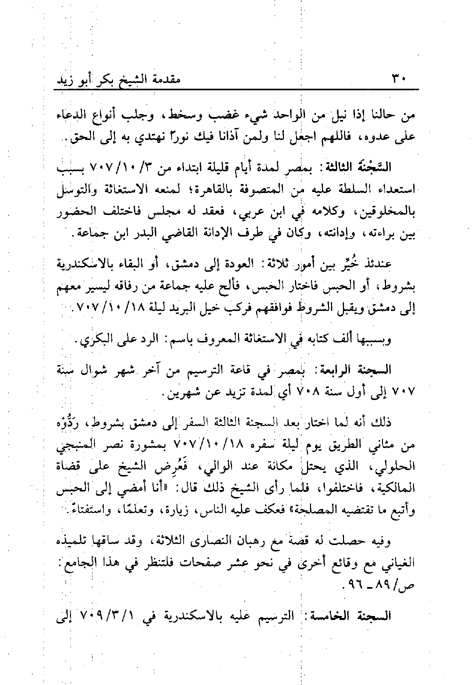 السَّجْنَة الثالثة: بمصر لمدة أيام قليلة ابتداء من 3/ 10 / 707 بسبب استعداء السلطة عليه من المتصوفة بالقاهرة؛ لمنعه الاستغاثة والتوسل بالمخلوقين، وكلامه في ابن عربي، فعقد له مجلس فاختلف الحضور بين براءته، وإدانته، وكان في طرف الإدانة القاضي البدر ابن جماعة.