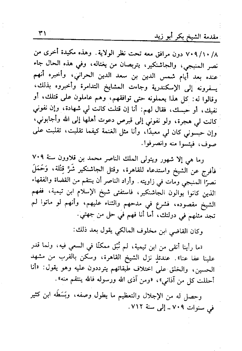 8/ 10 / 709 دون مرافق معه تحت نظر الولاية. وهذه مكيدة أخرى من نصر المنبجي، والجاشنكير، يتربصان من يغتاله، وفي هذه الحال جاء عنده بعد أيام شمس الدين بن سعد الدين الحراني، وأخبره أنهم يسفرونه إلى الإسكندرية وجاءت المشايخ التدامرة وأخروه بذلك، وقالوا له: كل هذا يعملونه حتى توافقهم، وهم عاملون على قتلك، أو نفيك، أو حبسك، فقال لهم: أنا إن قتلت كانت لي شهادة، وإن نفوني كانت لي هجرة، ولو نفوني إلى قبرص دعوت أهلها إلى الله وأجابوني، وإن حبسوني كان لي معبدًا، وأنا مثل الغنمة كيفما تقلبت، تقلبت على صوف، فيئسوا منه وانصرفوا.