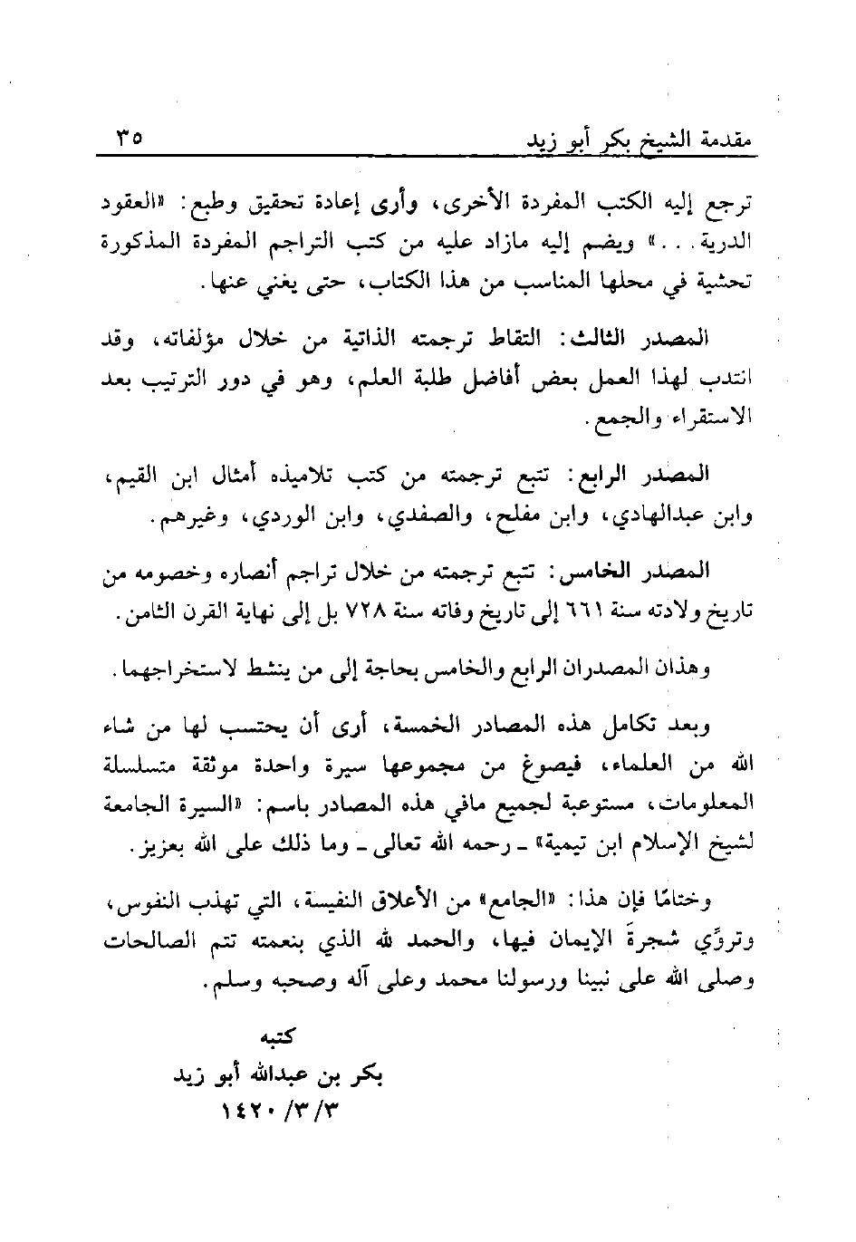 وبعد تكامل هذه المصادر الخمسة، أرى أن يحتسب لها من شاء الله من العلماء، فيصوغ من مجموعها سيرة واحدة موثقة متسلسلة المعلومات، مستوعبة لجميع ما في هذه المصادر باسم: "السيرة الجامعة لشيخ الإسلام ابن تيمية" -رحمه الله تعالى- وما ذلك على الله بعزيز.
