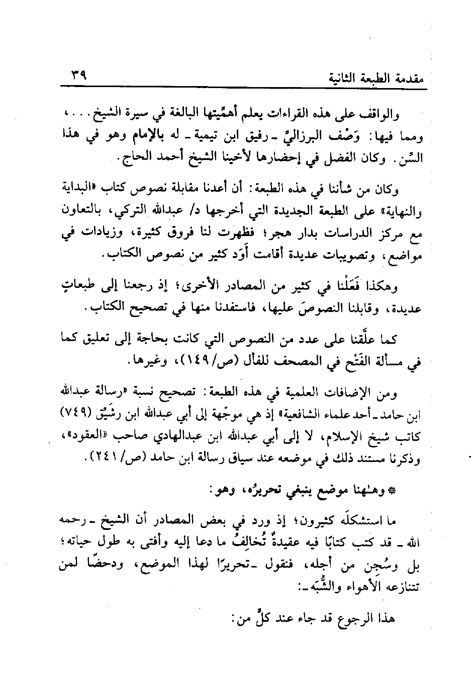 وكان من شأننا في هذه الطبعة: أن أعدنا مقابلة نصوص كتاب "البداية والنهاية" على الطبعة الجديدة التي أخرجها د / عبد الله التركي، بالتعاون مع مركز الدراسات بدار هجر؛ فظهرت لنا فروق كثيرة، وزيادات في مواضع، وتصويبات عديدة أقامت أَوَد كثير من نصوص الكتاب.
