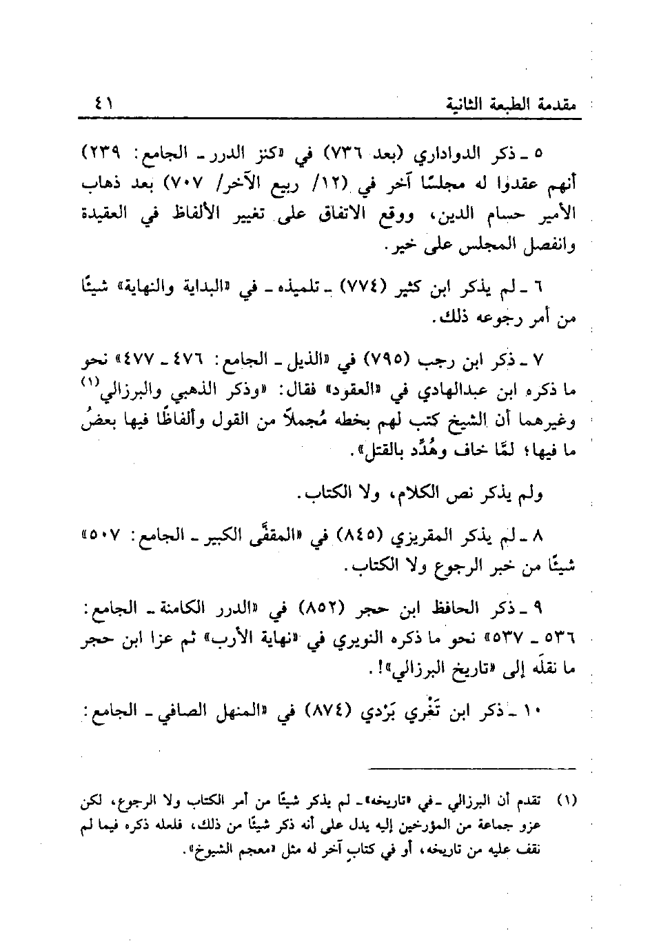 (¬1) تقدم أن البرزالي -في "تاريخه"- لم يذكر شيئًا من أمر الكتاب ولا الرجوع، لكن عزو جماعة من المؤرخين إليه يدل على أنه ذكر شيئًا من ذلك، فلعله ذكره فيما لم نقف عليه من تاريخه، أو في كتابٍ آخر له مثل "معجم الشيوخ".