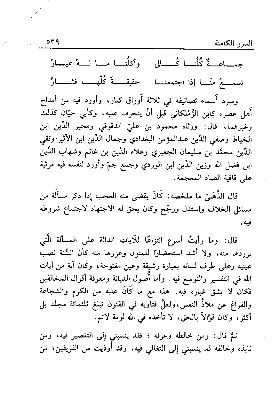 وسرد أَسماء تصانيفه في ثلاثة أَوراق كبار، وأورد فيه من أمداح أَهل عصره كابن الزَّمْلكاني قبل أنْ ينحرف عليه، وكأبي حيّان كذلك وغيرهما، قال: ورثاه محمود بن علىّ الدقوقي ومجير الدِّين ابن الخياط وصفي الدِّين عبد المؤمن البغدادي وجمال الدِّين ابن الأثير وتقي الدِّين محمَّد بن سليمان الجعبري وعلاء الدِّين بن غانم وشهاب الدِّين ابن فضل الله وزين الدِّين ابن الوردي وجمع جمّ وأورد لنفسه فيه مرثية على قافية الضاد المعجمة.