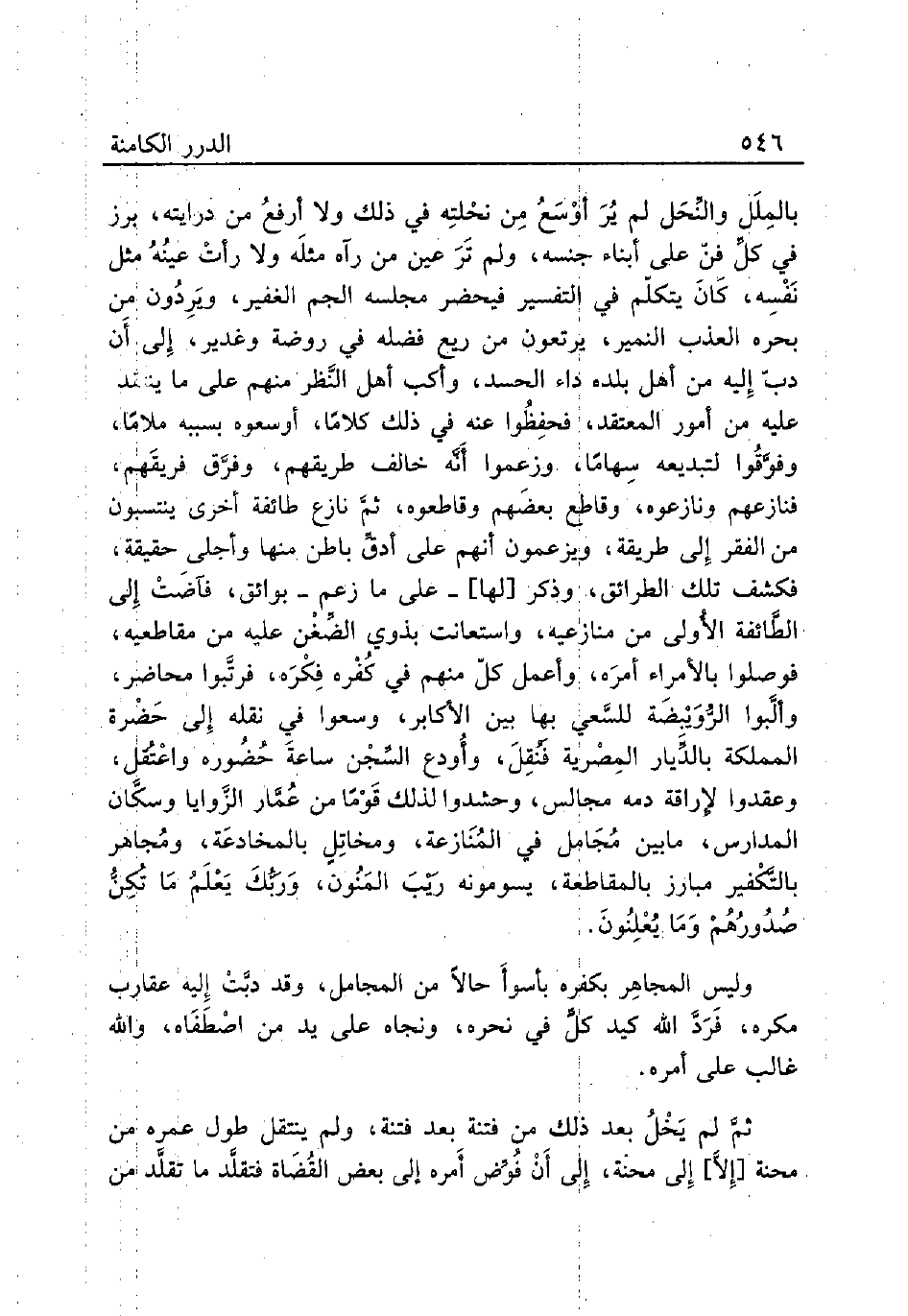 بالمِلَل والنِّحَل لم يُرَ أوْسَعُ مِن نحْلتِه في ذلك ولا أرفعُ من درايته، برز في كلِّ فنّ على أبناء جنسه، ولم تَرَ عين من رآه مثلَه ولا رأتْ عينُهُ مثل نَفْسِه، كَانَ يتكلّم في التفسير فيحضر مجلسه الجم الغفير، ويَرِدُون من بحره العذب النمير، يرتعون من ريع فضله في روضة وغدير، إِلى أَن دبّ إِليه من أهل بلده داء الحسد، وأكب أهل النَّظر منهم على ما ينتقد عليه من أمور المعتقد، فحفِظُوا عنه في ذلك كلامًا، أوسعوه بسببه ملامًا وفوَّقُوا لتبديعه سِهامًا، وزعموا أَنَّه خالف طريقهم، وفرَّق فريقَهم، فنازعهم ونازعوه، وقاطع بعضَهم وقاطعوه، ثمَّ نازع طائفة أخرى ينتسبون من الفقر إِلى طريقة، ويزعمون أنهم على أدقِّ باطن منها وأجلى حقيقة، فكشف تلك الطرائق، وذكر [لها]- على ما زعم - بوائق، فآضَتُ إِلى الطَّائفة الأٌولى من منازعيه، واستعانت بذوي الضِّغْن عليه من مقاطعيه، فوصلوا بالأمر أمرَه، وأعمل كلّ منهم في كُفْره فِكْرَه، فرتَّبوا محاضر، وألَّبوا الرُّوَيْبِضَة للسَّعي بها بين الأكابر، وسعوا في نقله إِلى حَضْرة المملكة بالدِّيار المِصْرية فَنُقِلَ، وأُودع السِّجْن ساعةَ حُضُوره واعْتُقِل، وعقدوا لإراقة دمه مجالس، وحشدوا لذلك قَوْمًا من عُمَّار الزَّوايا وسكَّان المدارس، ما بين مُجَامل في المُنَازعة، ومخاتِلٍ بالمخادعَة، ومُجاهر بالتَّكْفير مبارز بالمقاطعة، يسومونه رَيْبَ المَنُون، وَرَبُّكَ يَعْلَمُ مَا تُكِنُّ صُدُورُهُمْ وَمَا يُعْلِنُونَ.