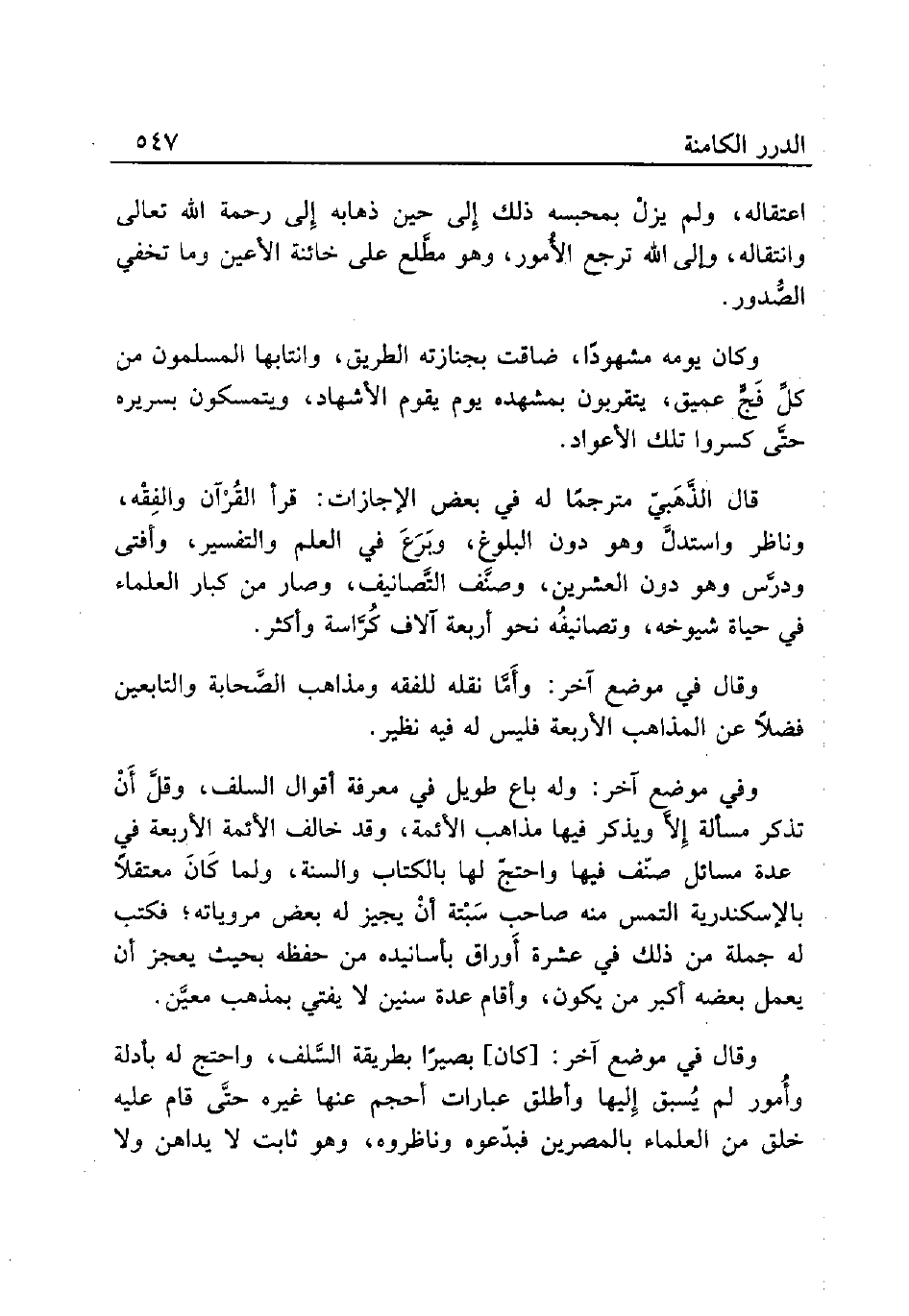 وفي موضوع آخر: وله باع طويل في معرفة أقوال السلف، وقلَّ أَنْ تذكر مسألة إِلاَّ ويذكر فيها مذاهب الأئمة، وقد خالف الأئمة الأربعة في عدة مسائل صنّف فيها واحتجّ لها بالكتاب والسنة، ولما كَانَ معتقلاً بالإسكندرية التمس منه صاحب سَبْته أنْ يجيز له بعض مروياته؛ فكتب له جملة من ذلك في عشرة أَوراق بأسانيده من حفظه بحيث يعجز أن يعمل بعضه أكبر من يكون، وأقام عدة سنين لا يفتي بمذهب معيَّن.