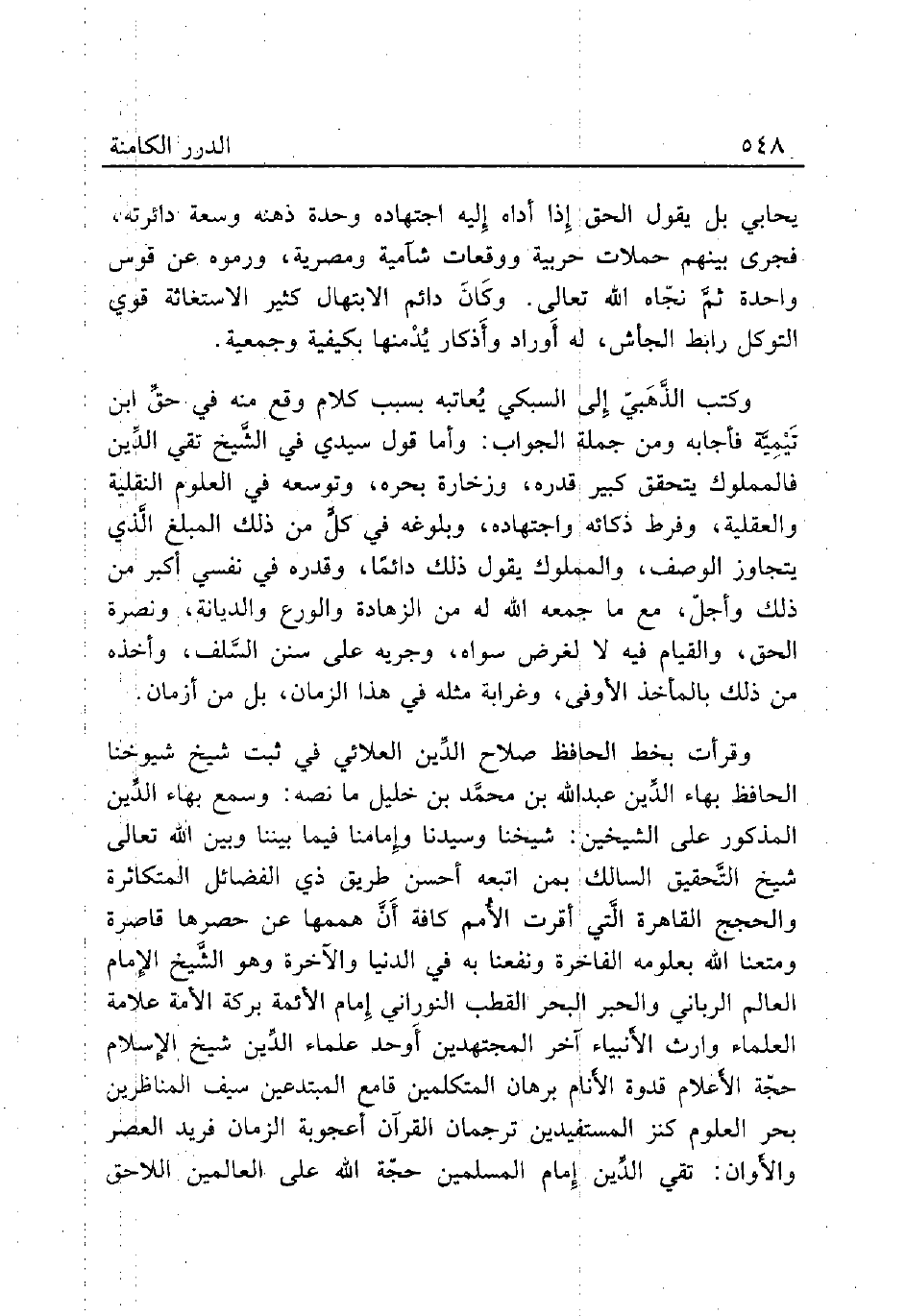 وقرأت بخط الحافظ صلاح الدِّين العلائي في ثبت شيخ شيوخنا الحافظ بهاء الدِّين عبد الله بن محمَّد بن خليل ما نصه: وسمع بهاء الدِّين المذكور على الشيخين: شيخنا وسيدنا وإِمامنا فيما بيننا وبين الله تعالى شيخ التَّحقيق السالك بمن اتبعه أحسن طريق ذي الفضائل المتكاثرة والحجج القاهرة الَّتي أقرت الأُمم كافة أَنَّ هممها عن حصرها قاصرة ومتعنا الله بعلومه الفاخرة ونفعنا به في الدنيا والآخرة وهو الشَّيخ الإِمام العالم الرباني والحبر البحر القطب النوراني إِمام الأئمة بركة الأمة علامة العلماء وارث الأَنبياء آخر المجتهدين أَوحد علماء الدِّين شيخ الإسلام حجّة الأَعلام قدوة الأَنام برهان المتكلمين قامع المبتدعين سيف المناظرين بحر العلوم كنز المستفيدين ترجمان القرآن أعجوبة الزمان فريد العصر والأَوان: تقي الدِّين إِمام المسلمين حجّة الله على العالمين اللاحق