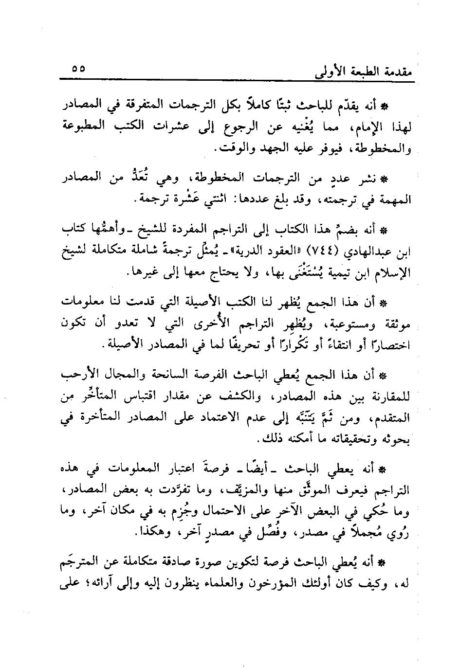 * أنه بضمِّ هذا الكتاب إلى التراجم المفردة للشيخ -وأهمُّها كتاب ابن عبد الهادي (744) "العقود الدرية" -يُمثِّل ترجمةً شاملة متكاملة لشيخ الإِسلام ابن تيمية يُسْتَغْنَى بها, ولا يحتاج معها إلى غيرها.