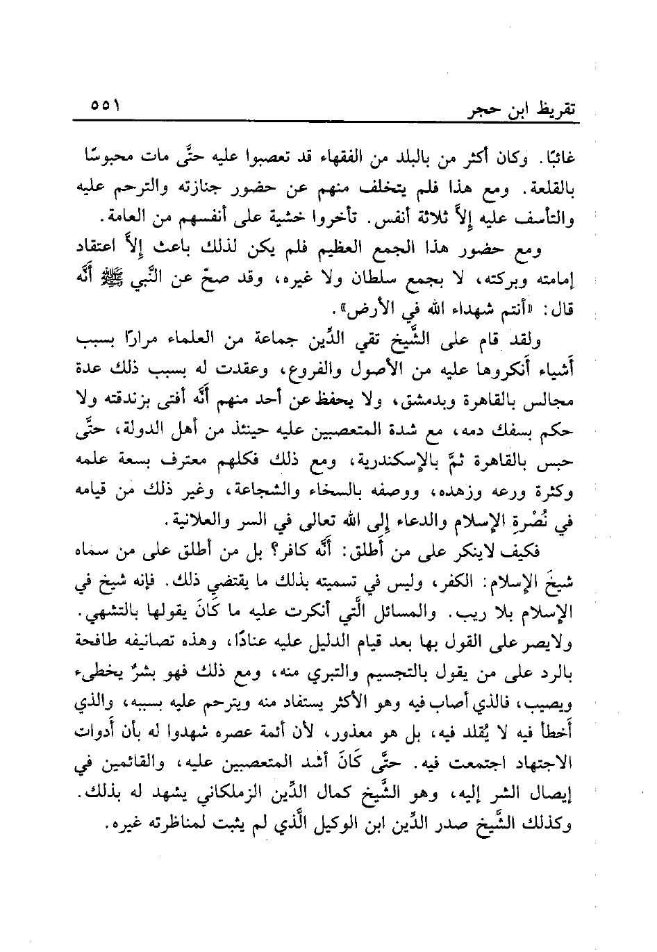 فكيف لاينكر على من أَطلق: أَنَّه كافر؟ بل من أطلق على من سماه شيخَ الإِسلام: الكفر، وليس في تسميته بذلك ما يقتضي ذلك. فإنه شيخ في الإِسلام بلا ريب. والمسائل الَّتي أنكرت عليه ما كَانَ يقولها بالتشهي. ولايصر على القول بها بعد قيام الدليل عليه عنادًا، وهذه تصانيفه طافحة بالرد على من يقول بالتجسيم والتبري منه، ومع ذلك فهو بشرٌ يخطئ ويصيب، فالذي أصاب فيه وهو الأكثريستفاد منه ويترحم عليه بسببه، والذي أَخطأ فيه لا يُقلد فيه، بل هو معذور، لأن أئمة عصره شهدوا له بأن أَدوات الاجتهاد اجتمعت فيه. حتَّى كَانَ أشد المتعصبين عليه، والقائمين في إيصال الشر إليه، وهو الشَّيخ كمال الدِّين الزملكاني يشهد له بذلك. وكذلك الشَّيخ صدر الدِّين ابن الوكيل الَّذي لم يثبت لمناظرته غيره.