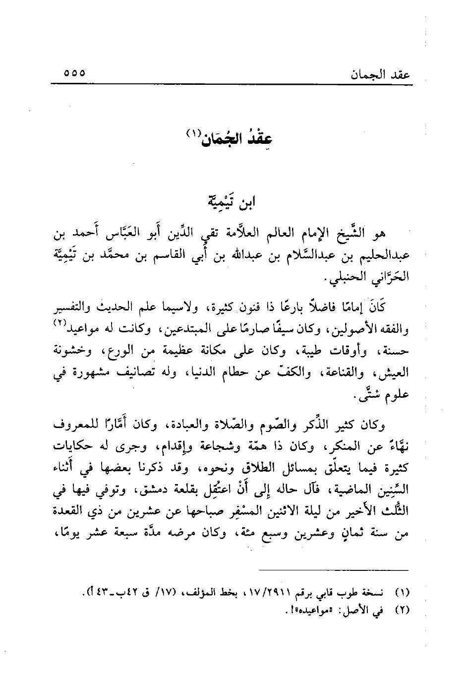 هو الشَّيخ الإِمام العالم العلاَّمة تقي الدِّين أَبو العَبَّاس أَحمد بن عبد الحليم بن عبد السَّلام بن عبد الله بن أَبي القاسم بن محمَّد بن تَيْمِيِّة الحَرَّاني الحنبلي.