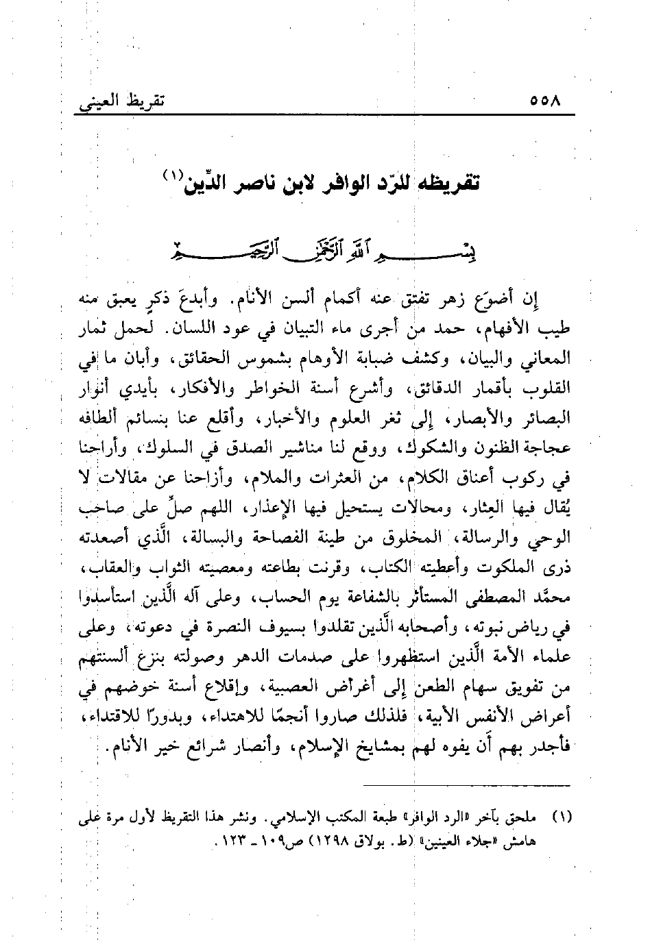 (¬1) ملحق بآخر "الرد الوافي" طبعة المكتب الإسلامي. ونشر هذا التقريظ لأول مرة على هامش "جلاء العينين" (ط. بولاق 1298) ص 109 - 123.