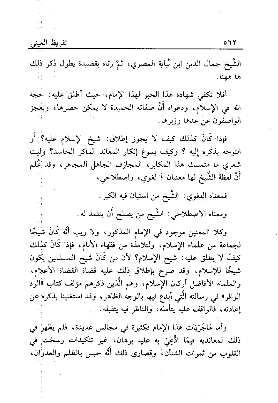 وكلا المعنين موجود في الإمام المذكور، ولا ريب أَنَّه كَانَ شيخًا لجماعة من علماء الإِسلام، ولتلامذة من فقهاء الأنام، فإذا كَانَ كذلك كيفَ لا يطلق عليه: شيخ الإِسلام؟ لأن من كَانَ شيخ المسلمين يكون شيخًا للإسلام، وقد صرح بإطلاق ذلك عليه قضاة القضاة الأعلام، والعلماء الفاضل أركان الإِسلام، وهم الَّذين ذكرهم مؤلف كتاب «الرد الوافر» في رسالته الَّتي أبدع فيها بالوجه الظاهر، وقد استغنينا بذكره عن إعادته، فالواقف عليه يتامله، والناظر فيه يتقبله.