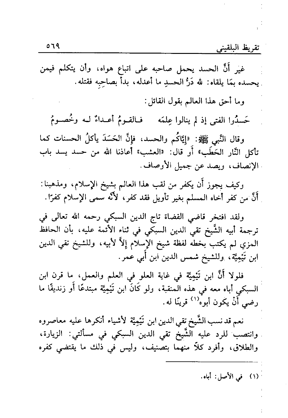 فلولا أَنَّ ابن تَيْمِيَّة في غاية العلو في العلم والعمل، ما قرن ابن البسبكي أباه معه في هذه المنقبة، ولو كَانَ ابن تَيْمِيَّة مبتدعًا أَو زنديقًا ما رضي أَنْ يكون أبوه (¬1) قرينًا له.
