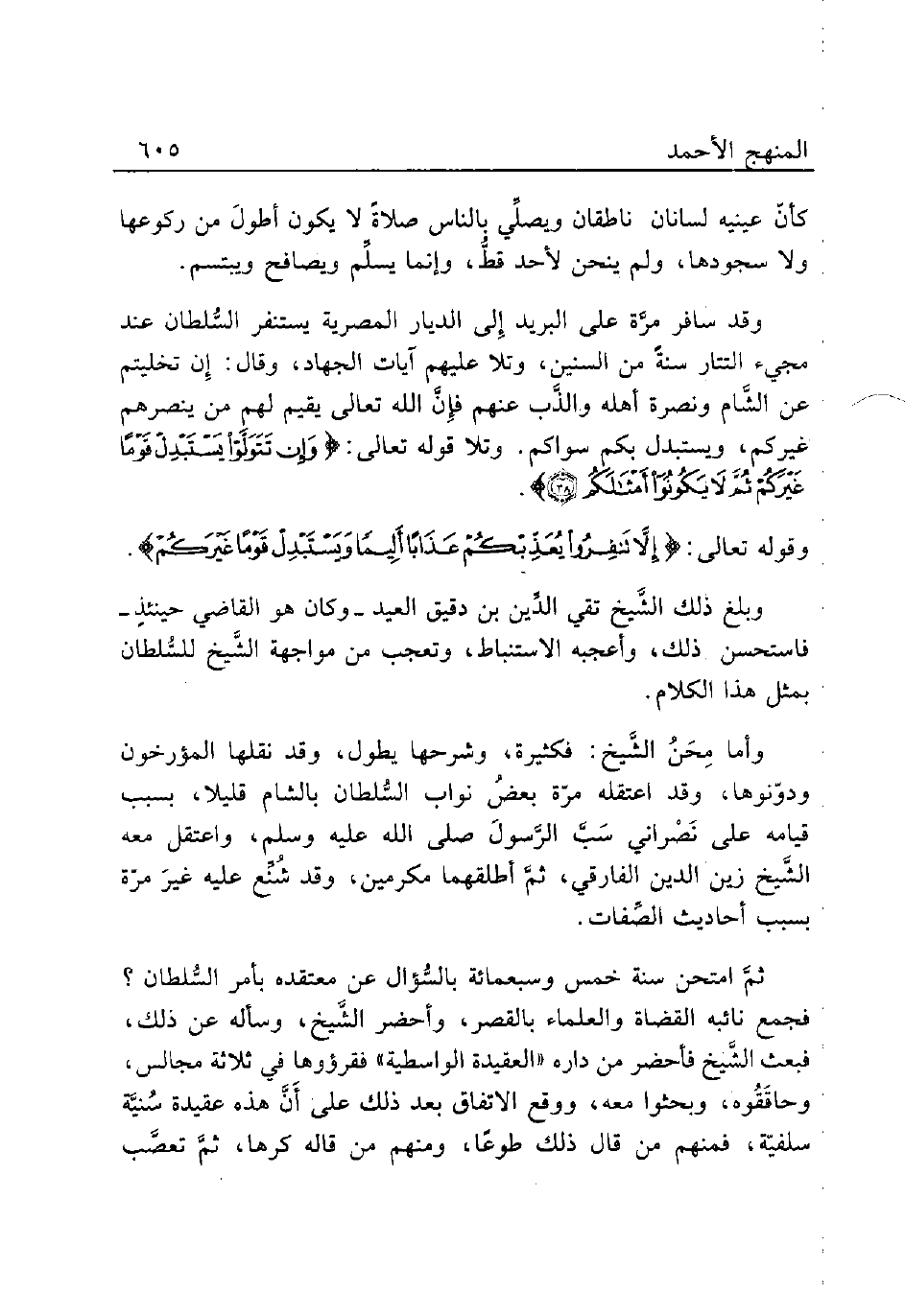 ثمَّ امتحن سنة خمس وسبعمائة بالسُّؤال عن معتقده بأمر السُّلطان؟ فجمع نائبه القضاة والعلماء بالقصر، وأحضر الشَّيخ، وسأله عن ذلك، فبعث الشَّيخ فأحضر من داره «العقيدة الواسطية» فقرؤوها في ثلاثة مجالس، وحاقَقُوه، وبحثوا معه، ووقع الاتفاق بعد ذلك على أّنَّ هذه عقيدة سُنيَّة سلفيّة، فمنهم من قال ذلك طوعًا، ومنهم من قاله كرها، ثمَّ تعصَّب